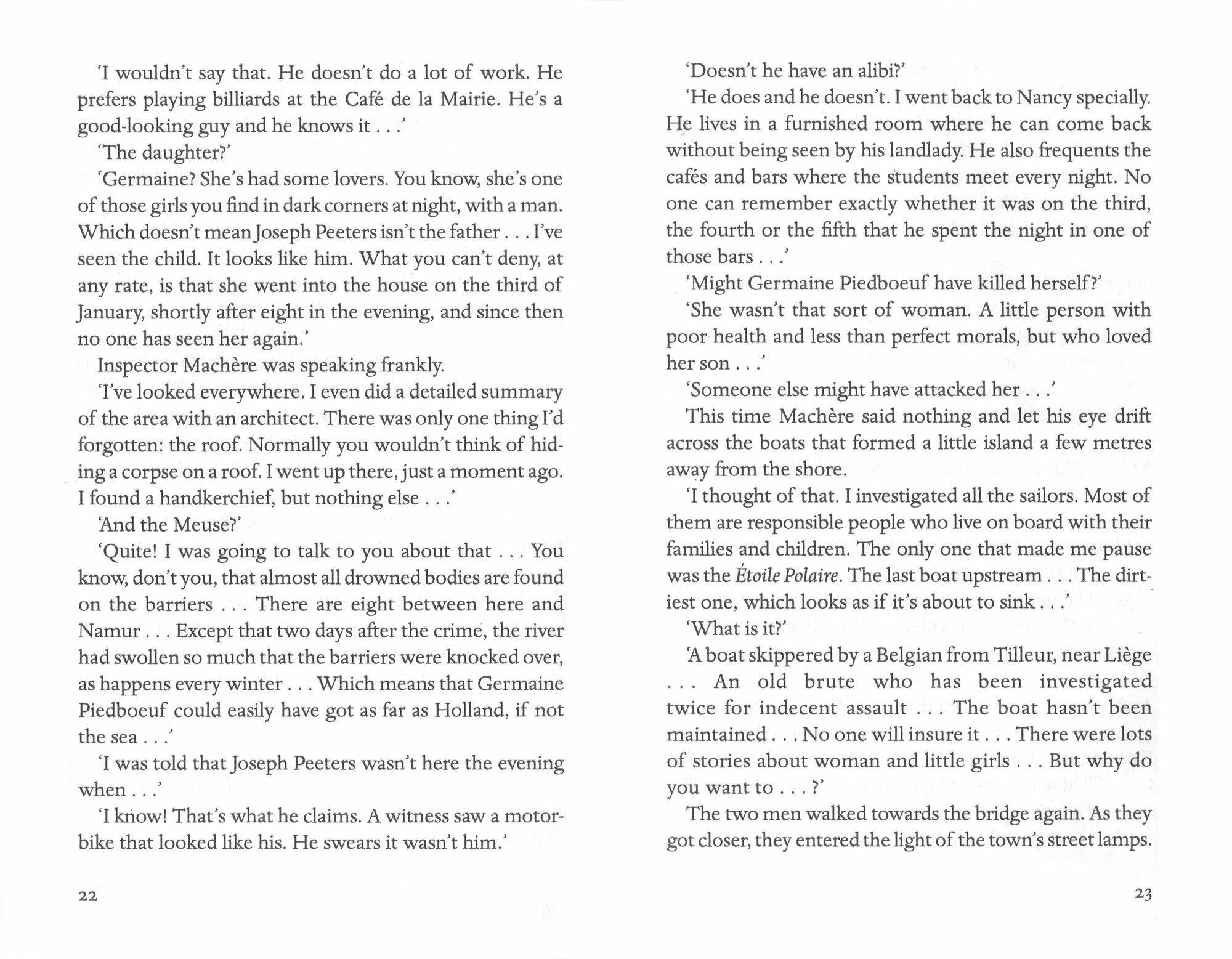 Maigret is asked to the windswept, rainy border town of Givet by a young woman desperate to clear her family of murder. But their well-kept shop, the sleepy community and its raging river all hide their own mysteries.