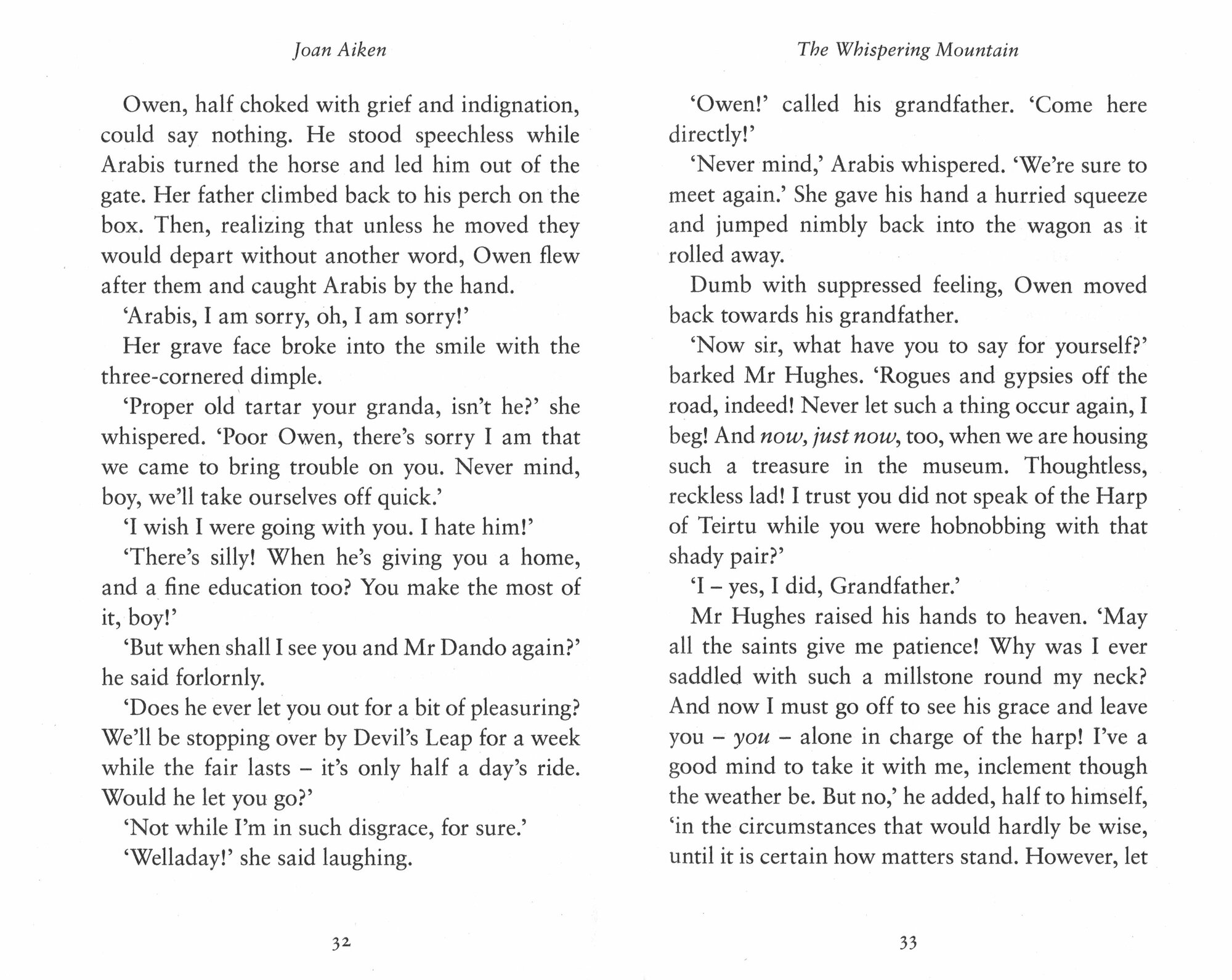 In The Whispering Mountain by Joan Aiken, the small town of Pennygaff, the legendary Harp of Teirtu is found - and lost again. For young Owen Hughes and his friend Arabis, it is the start of a hair-raising race to save the harp from sinister Lord Malyn. As they struggle to keep it out of his hands, they are plunged into a wild adventure involving murder, kidnapping, underground worlds, savage beasts, floods, avalanche, the mysterious children of the Pit - and above all, a man who will stop at nothing to get the harp back again.