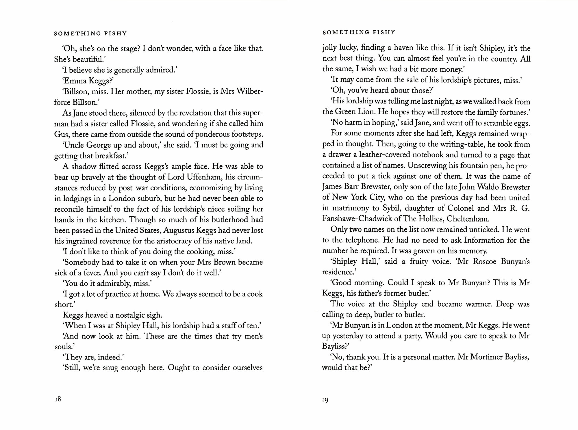 Set in the Elysian suburb of Valley Fields where the sixth Viscount Uffenham is lodging with his former butler while his ancestral mansion is let to an American millionaire, Something Fishy follows the romantic fortunes of Lord Uffenham’s niece, Jane, her unspeakable fiance, and Bill Hollister, the dashing stranger who comes to her rescue. When all the characters find themselves involved in the fate of a million-pound fortune, the stage is set for a classic chain of comic muddles and misunderstandings which naturally result in Bill getting both the girl and the cash.