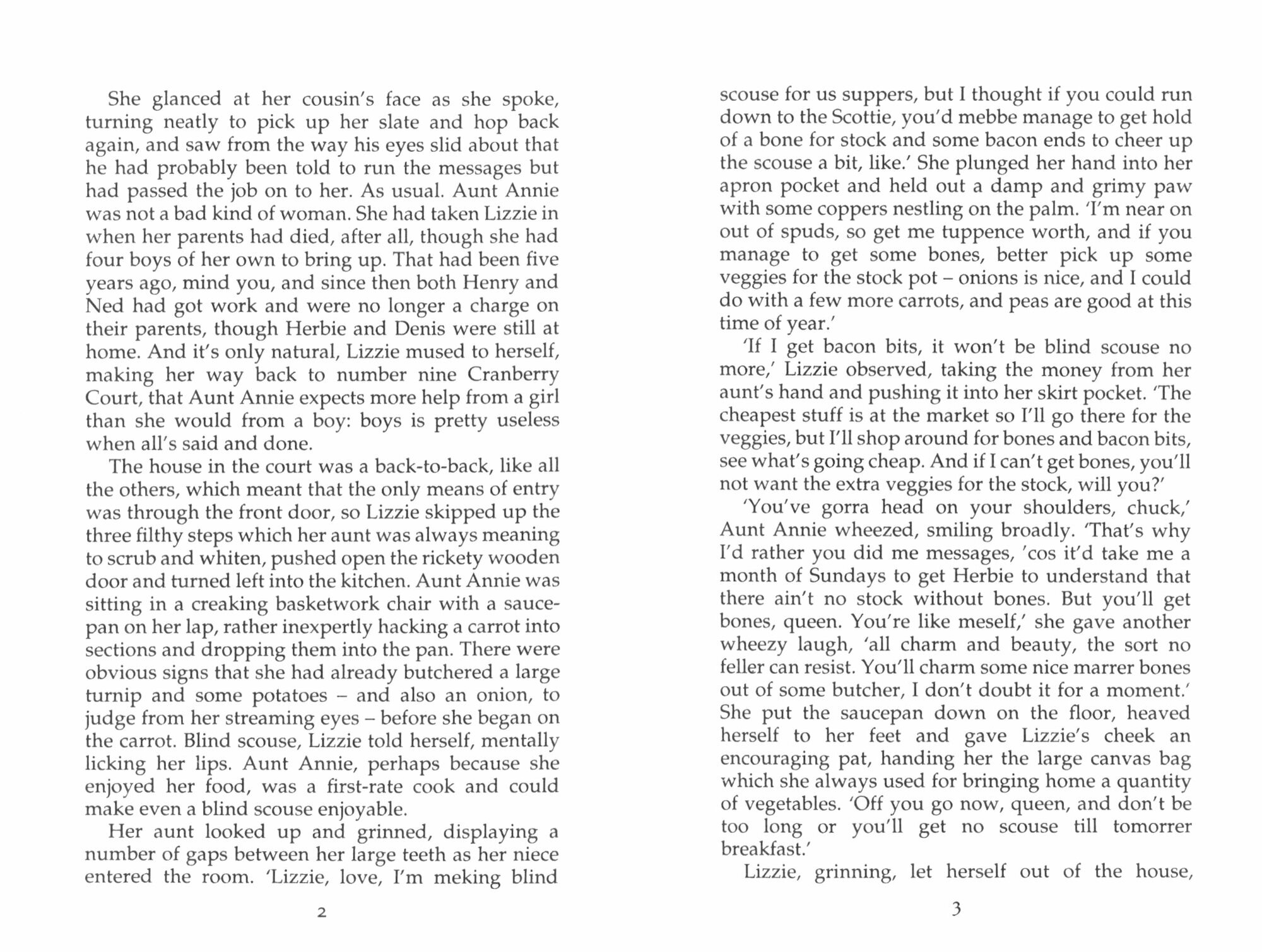 Lizzie is an orphan living with her Aunt Annie, Uncle Perce and two boy cousins in Cranberry Court, within a stone's throw of the Leeds and Liverpool Canal. Lizzie loves her aunt but is hated by her uncle and escapes whenever she can.