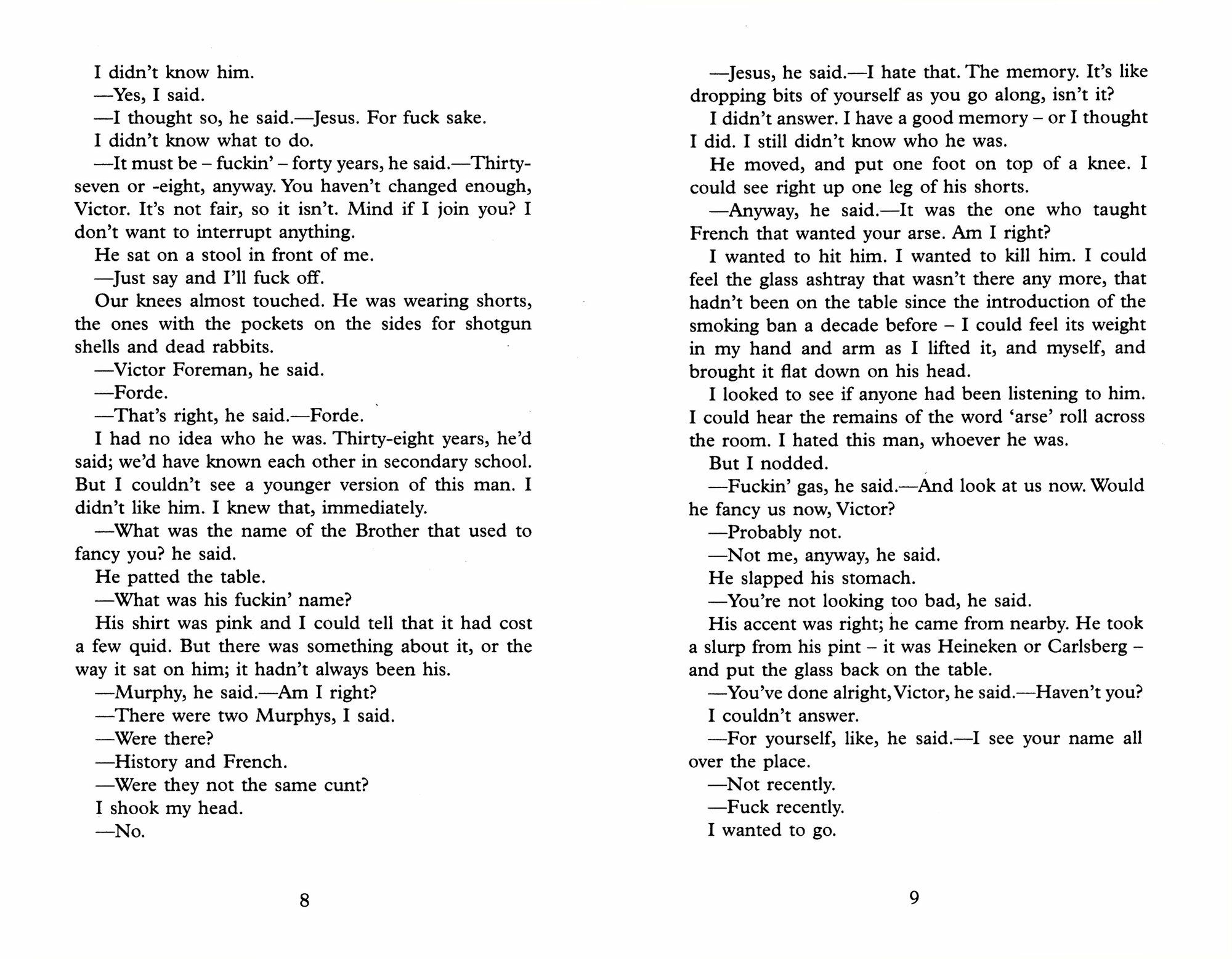 One evening his drink is interrupted. A man in shorts and a pink shirt brings over his pint and sits down. He seems to know Victor’s name and to remember him from school. Says his name is Fitzpatrick.