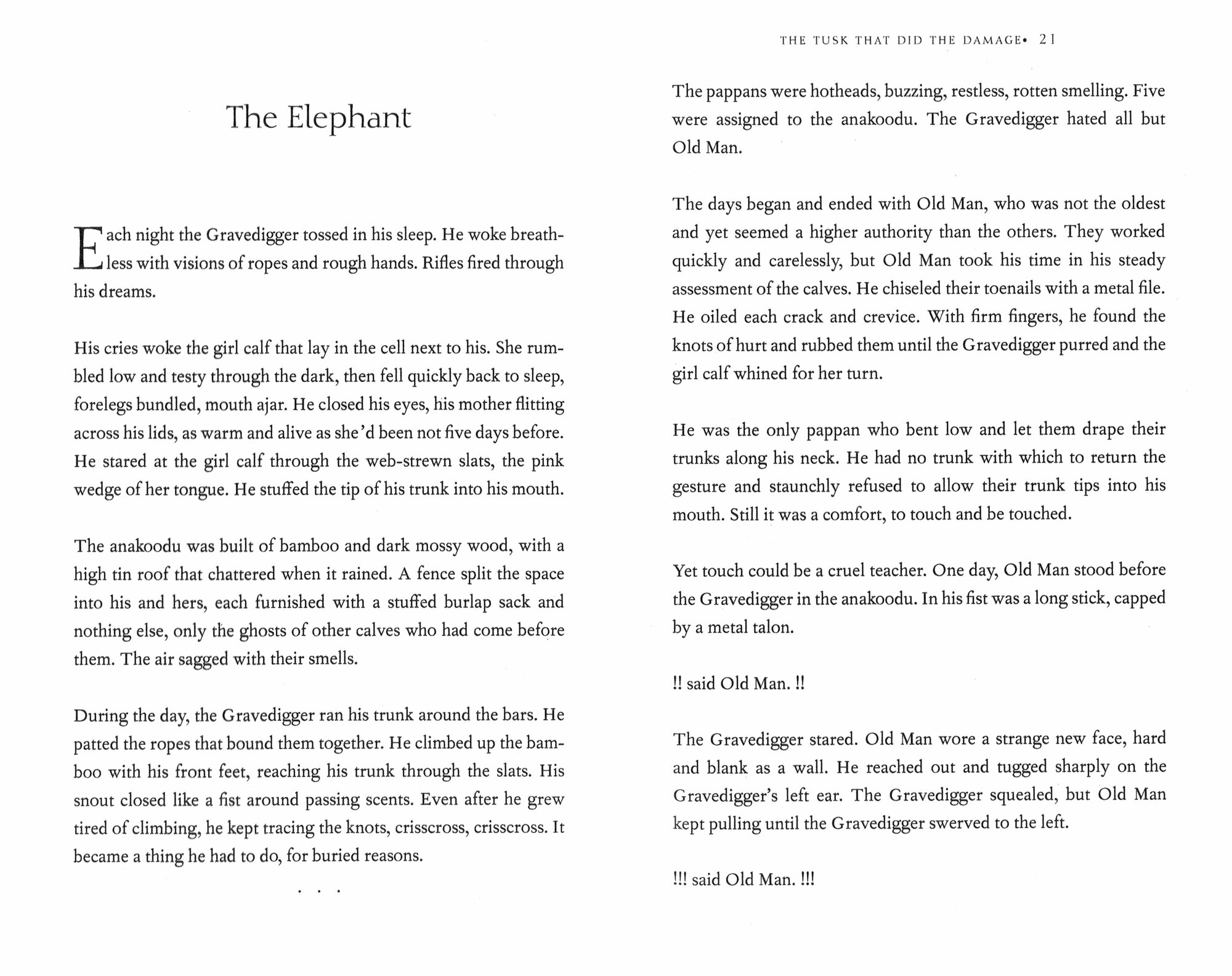 'There he was, his trunk wrapped in hers. Whatever hurt or sorrow befell him was not really happening to him. He was on the other bank with his mother. He was not here'