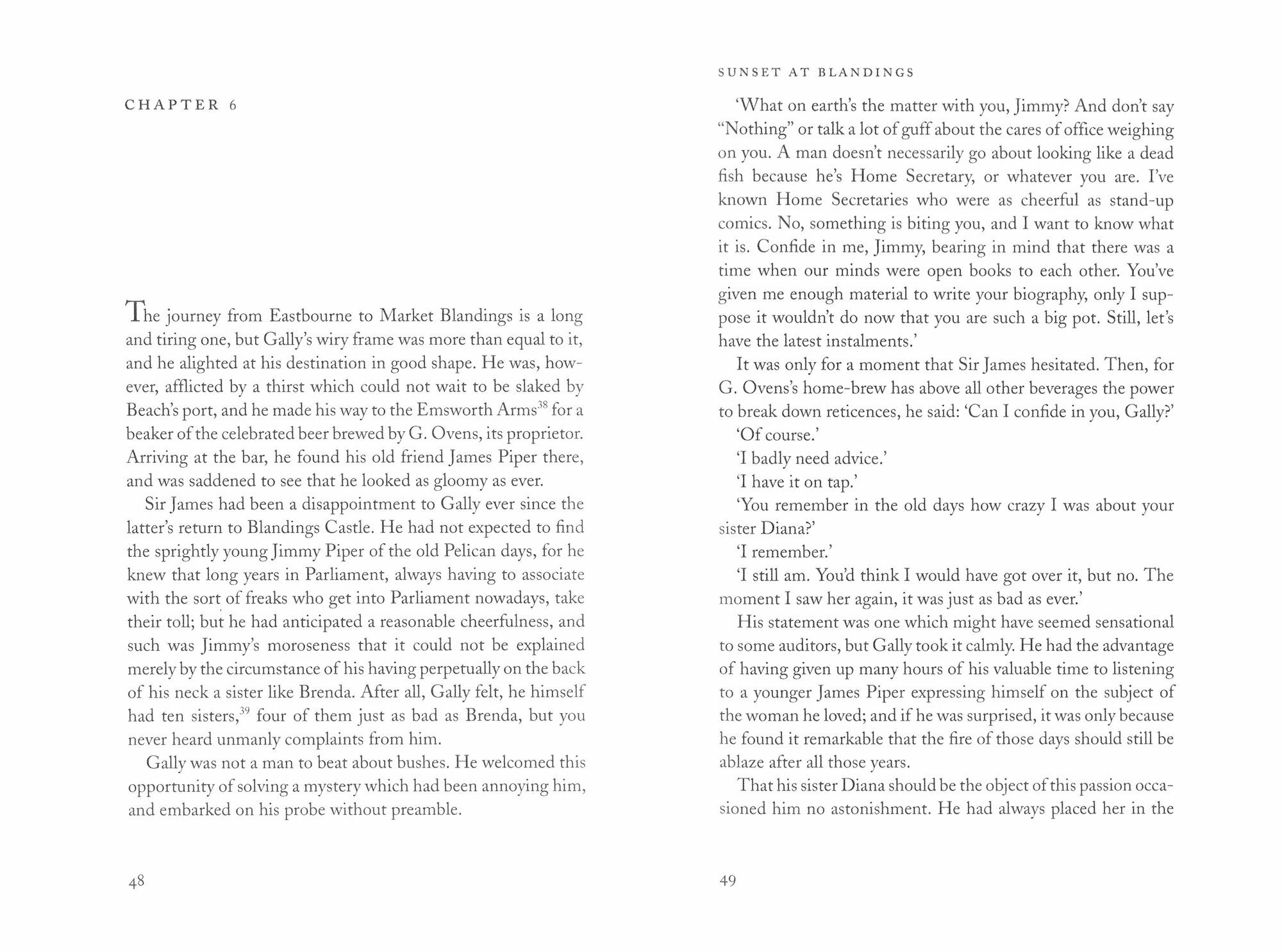 Many old friends reappear to take their last bow: the Earl of Emsworth, Dame Daphne Winkworth, Beach the butler, the Empress of Blandings (Lord Emsworth's prize pig), Freddie Threepwood (his son), G. Ovens, innkeeper, and an array of the earl's formidable sisters, including newcomers Florence and Diana.