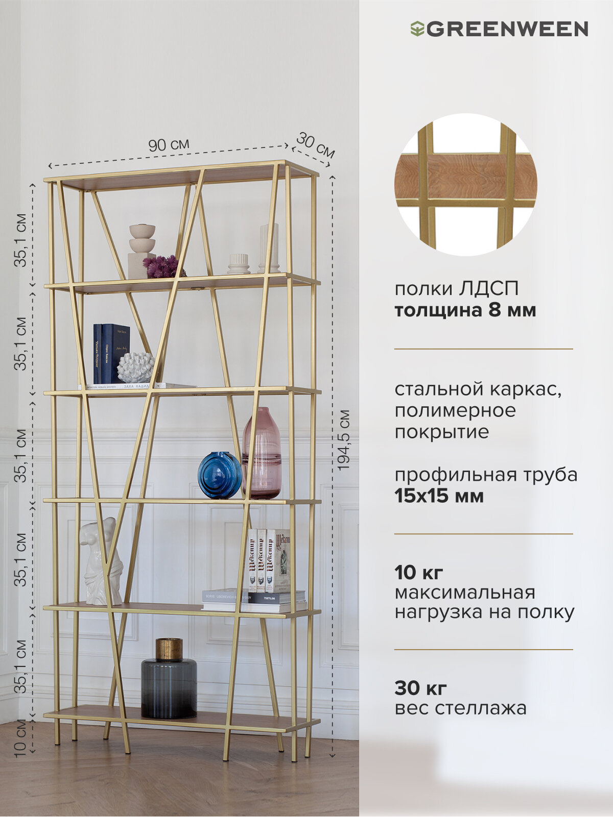 Золотой стеллаж EVA с полками из ЛДСП привлекает внимание элегантным дизайном и функциональностью. Утонченное сочетание золотого каркаса и деревянных полок позволит разместить стеллаж в современном интерьере.