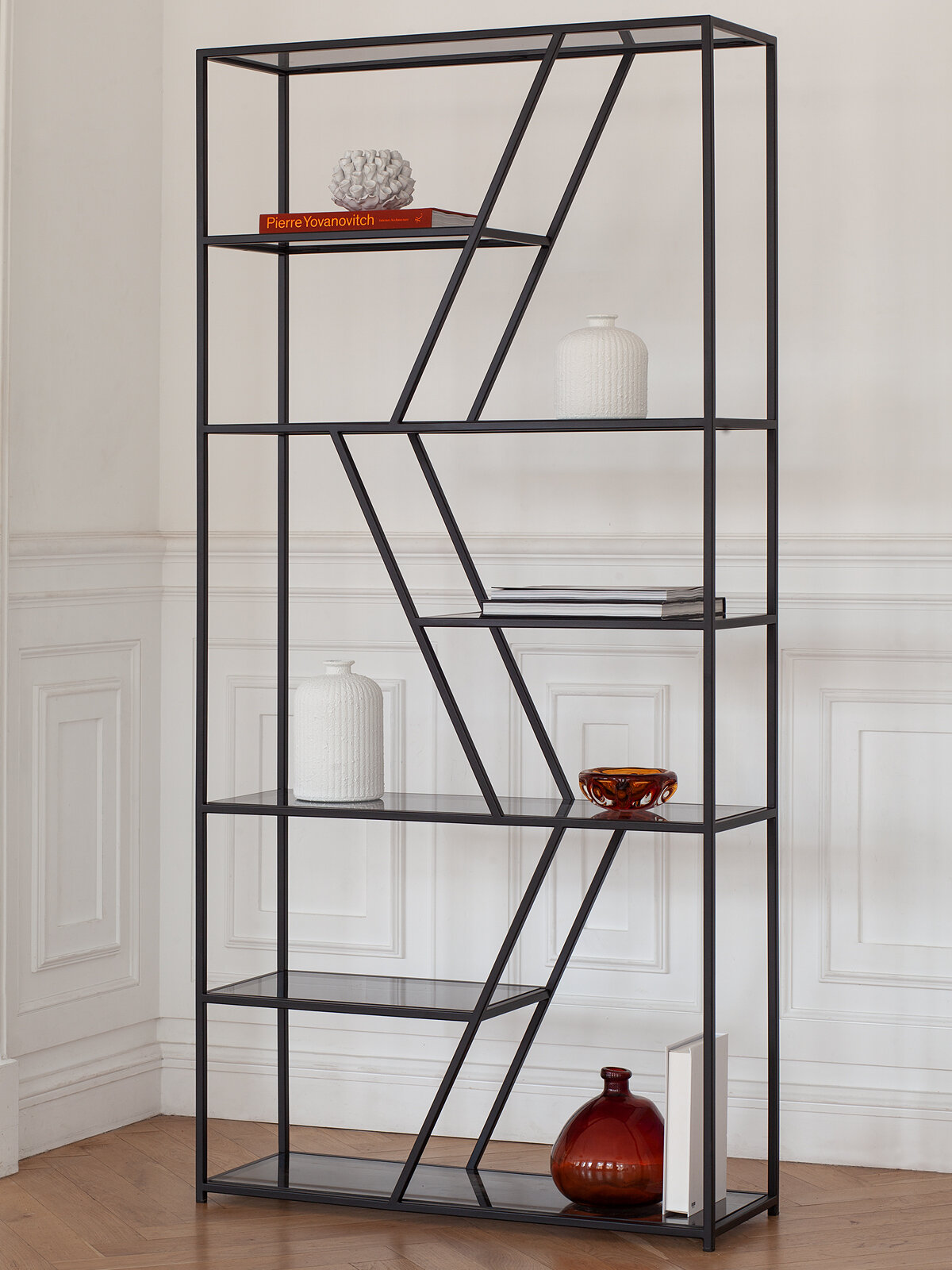 Стеллаж со стеклянными полками подойдет для зонирования пространства квартиры, загородного дома, офиса, студии и салона.