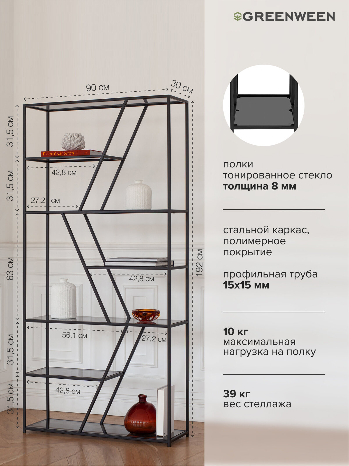 Стеллаж спроектирован и собран на собственном производстве GreenWeen, где мы внимательно следим за качеством материалов и готовых изделий.