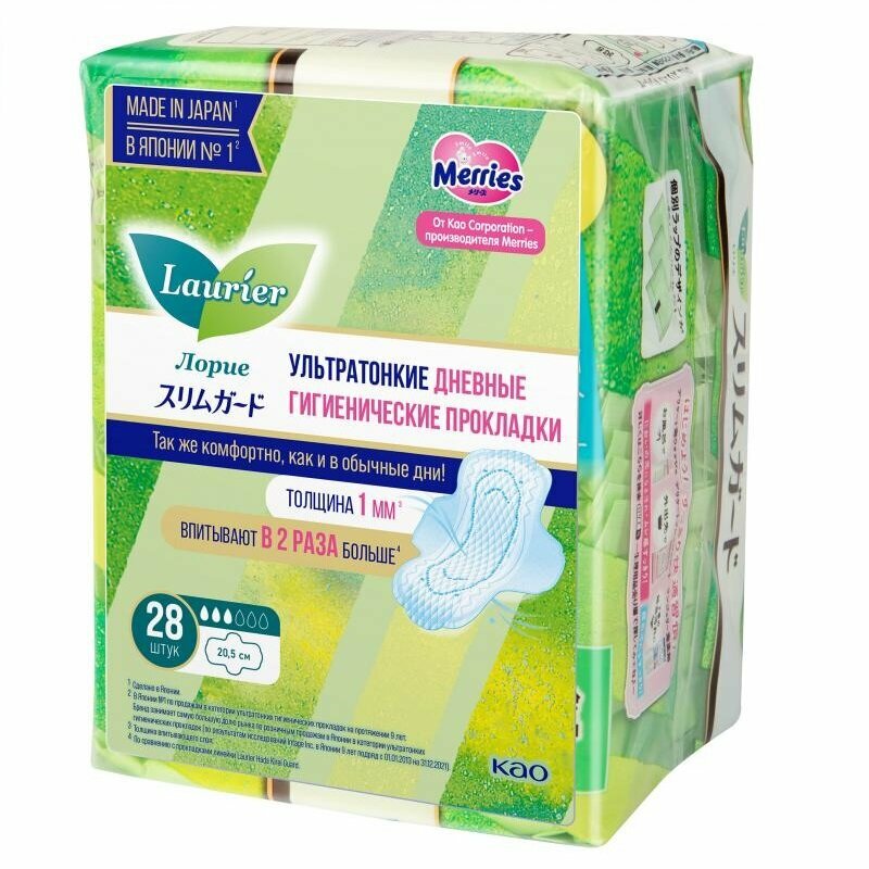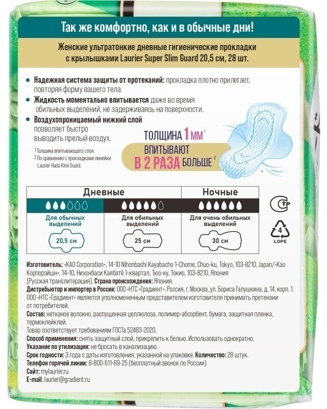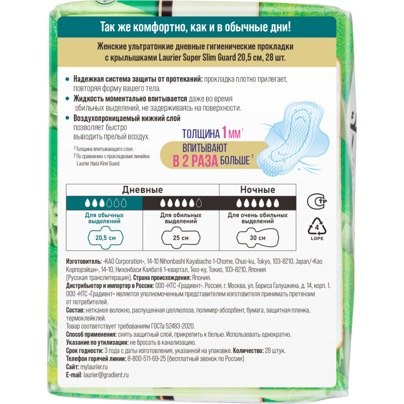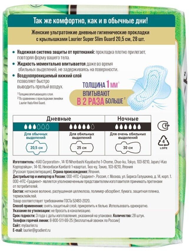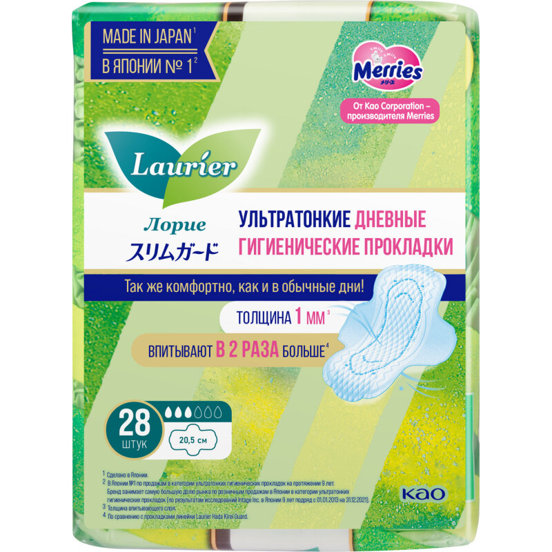 Ультратонкие гигиенические прокладки с крылышками Laurier Super Slim Guard предназначены для использования в дневное время суток. Благодаря невероятно тонкому впитывающему слою (всего 1 мм) прокладка практически не ощущается на коже. Прокладки обеспечивают безупречный комфорт, надежно прилегают, повторяя форму тела, и подходят даже тем, у кого чрезвычайно чувствительная кожа.