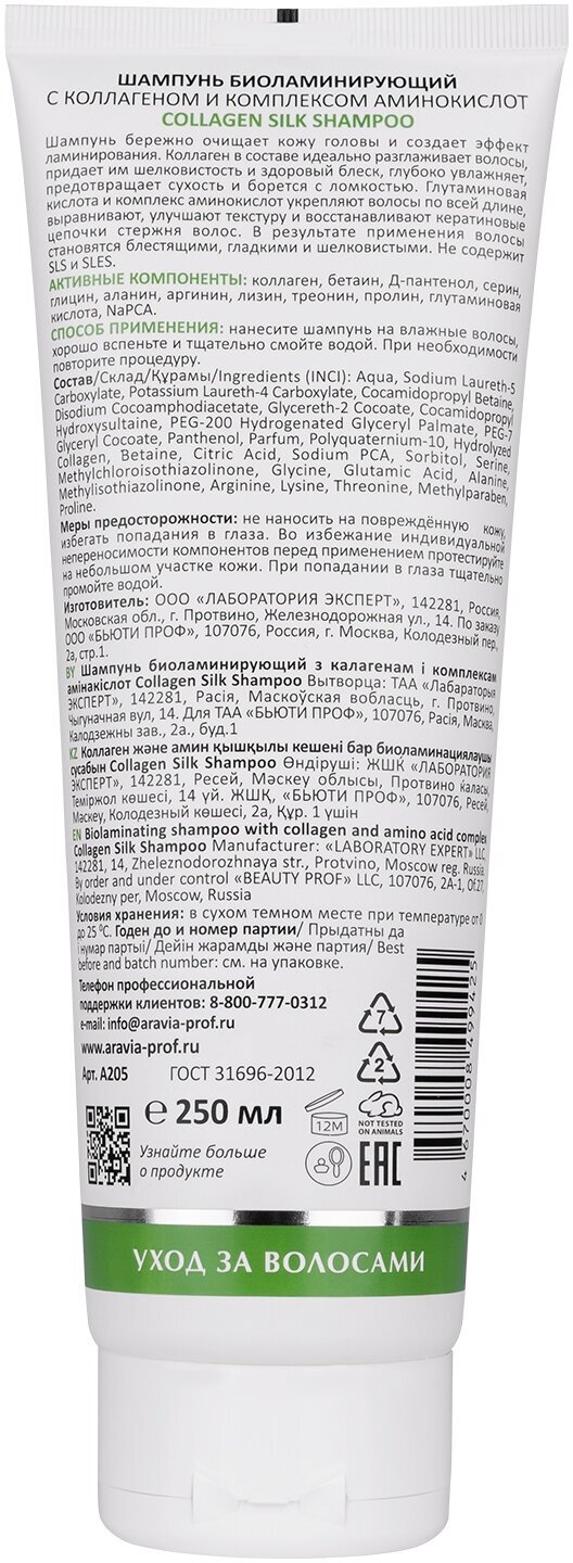 Шампунь биоламинирующий с коллагеном и комплексом аминокислот Collagen Silk Shampoo 250 мл Aravia Laboratories (ЭХ99989435395)