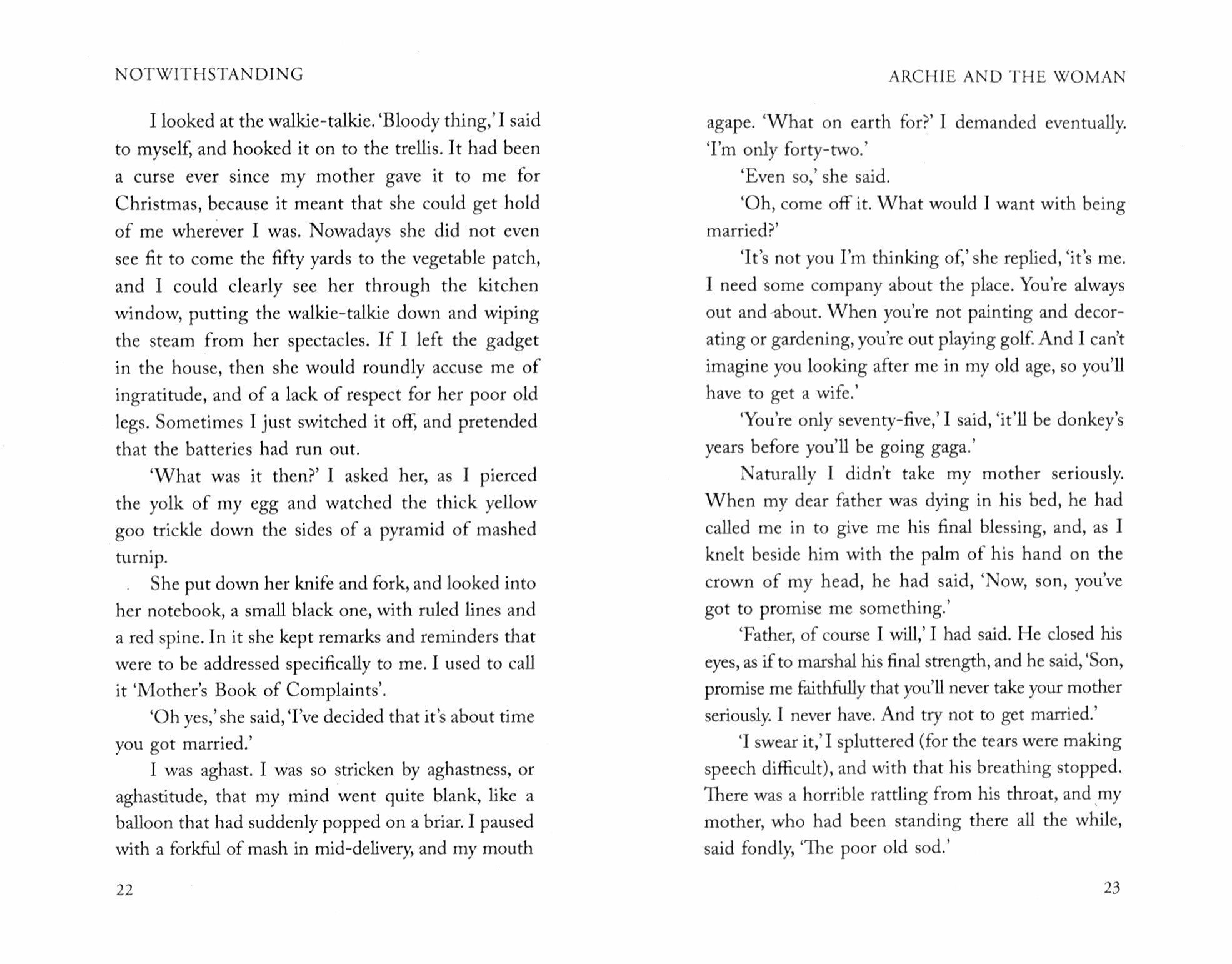 Welcome to the village of Notwithstanding, where a lady dresses in plus fours and shoots squirrels, a retired general gives up wearing clothes altogether, a spiritualist lives in a cottage with the ghost of her husband, and people think it quite natural to confide in a spider that lives in a potting shed. Based on de Bernieres' recollections of the village he grew up in, Notwithstanding is a funny and moving depiction of a charming vanished England.