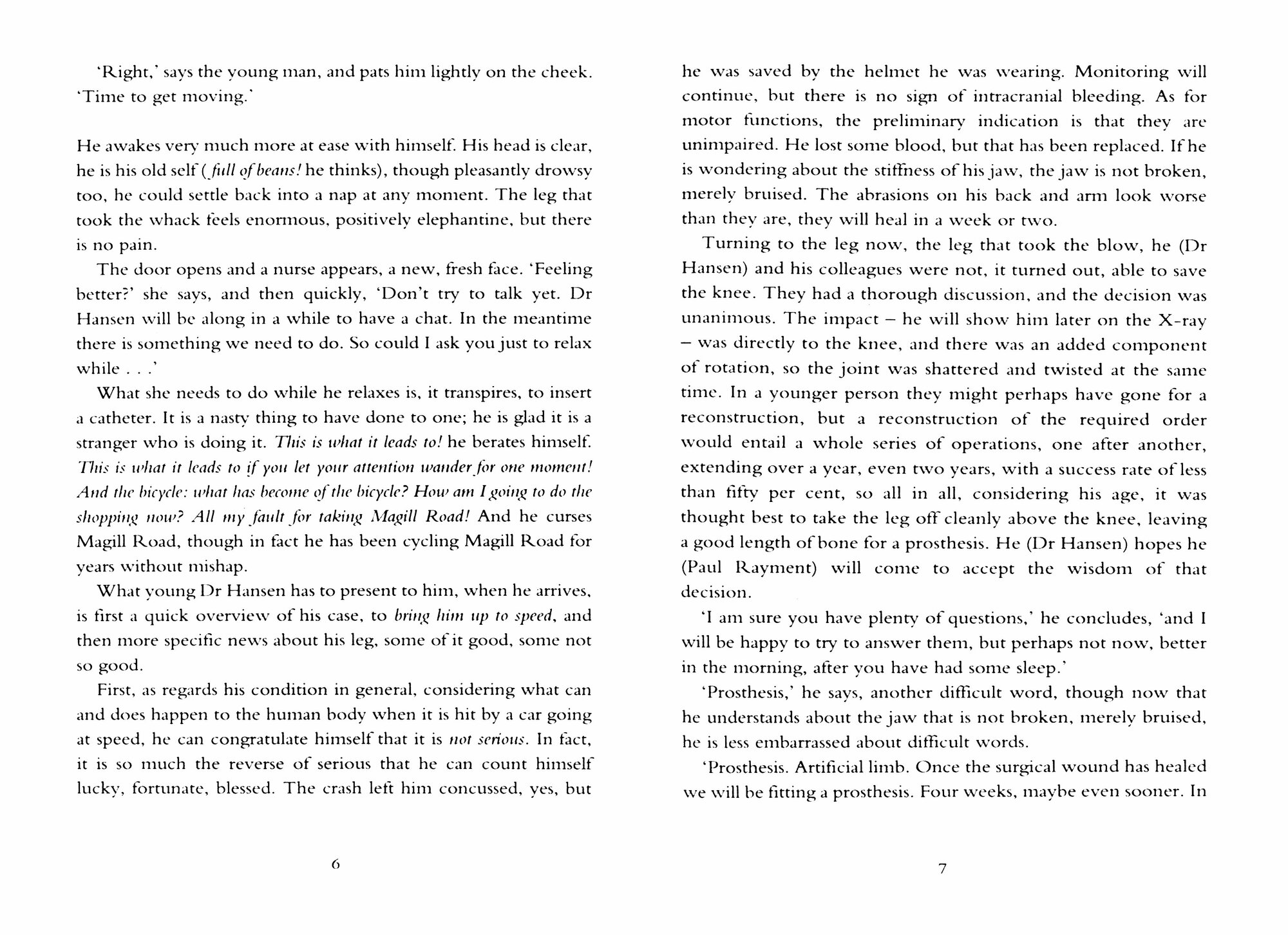 Paul Rayment is on the threshold of a comfortable old age when a calamitous cycling accident results in the amputation of a leg. Humiliated, his body truncated, his life circumscribed, he turns away from his friends.