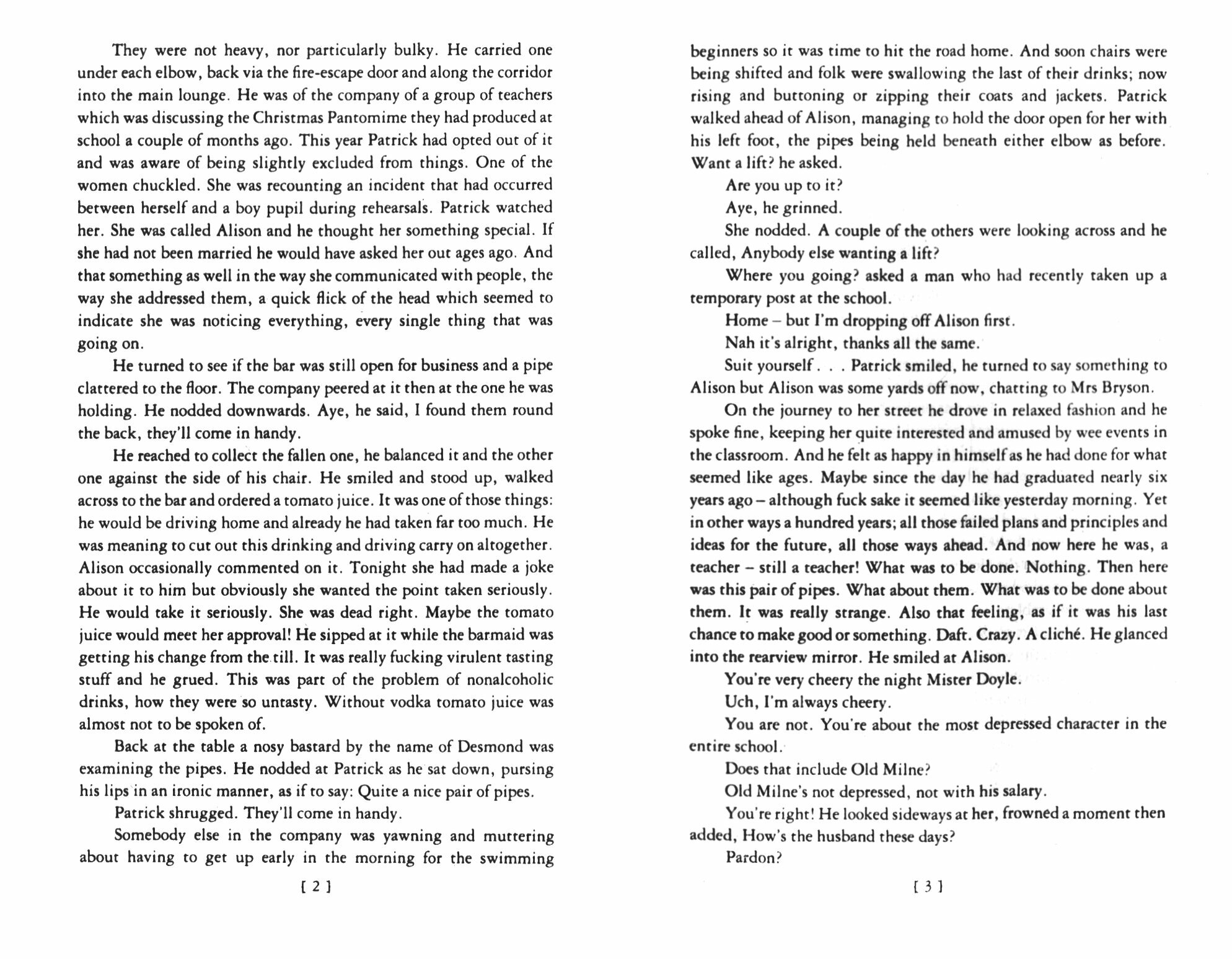 Patrick Doyle is a twenty-nine-year-old teacher in an ordinary comprehensive school. Isolated, frustrated and increasingly bitter at the system he is employed to maintain, he begins his rebellion, fuelled by drink and his passionate, unrequited love for a fellow teacher.