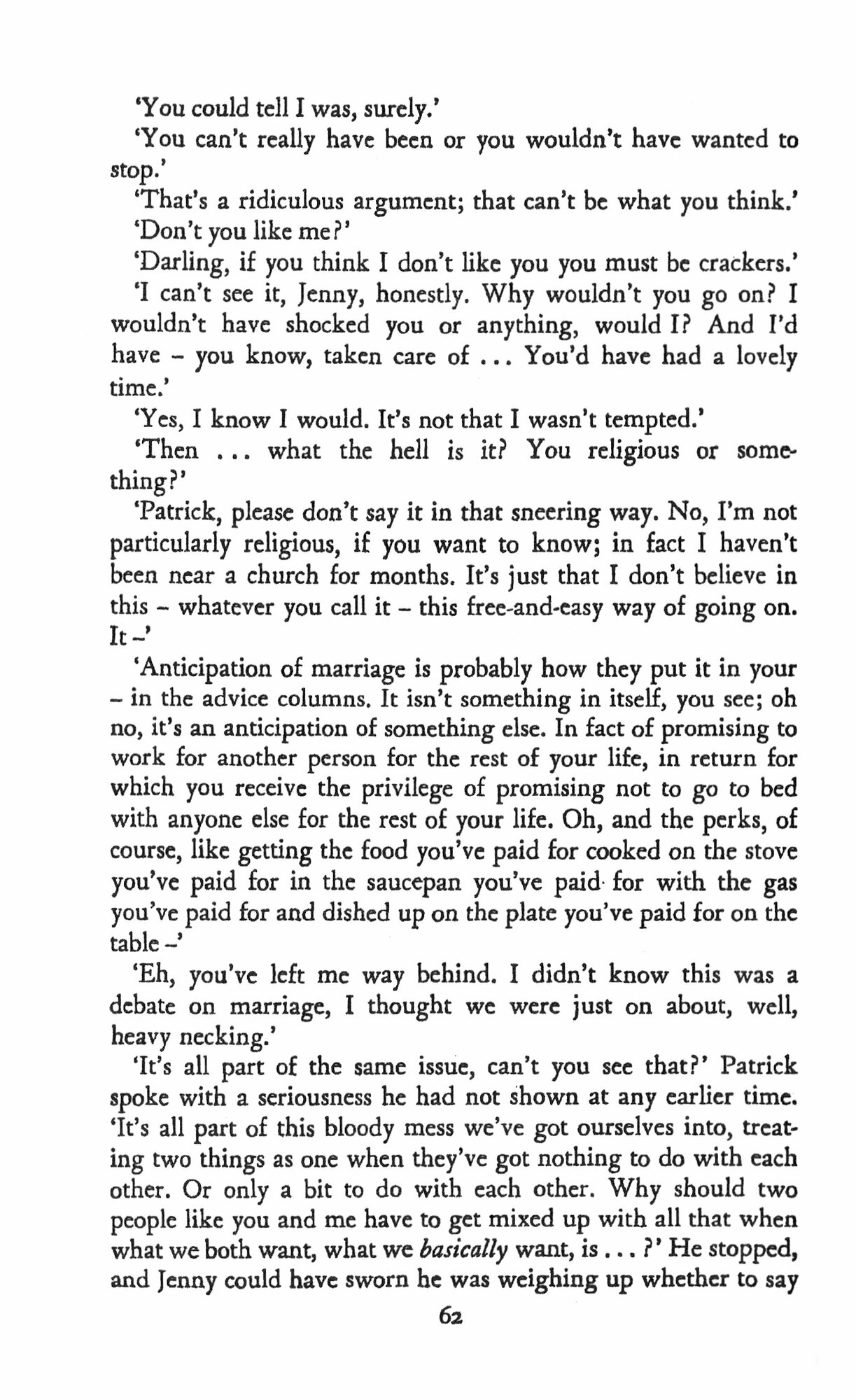In Kingsley Amis's Take A Girl Like You, twenty year old Jenny Bunn is supernally beautiful and stubbornly chaste, which is why Patrick Standish, an arrogant schoolmaster, wants her so much. This perceptive coming of age novel about a northern girl who moves south, wants to fit in and yet wants to preserve her principles, challenges our assumptions about the battle of the sexes and classes in Britain. It is a story about 'the squalid business of the man and the woman' and 'the most wonderful thing that had ever happened' to Jenny Bunn.