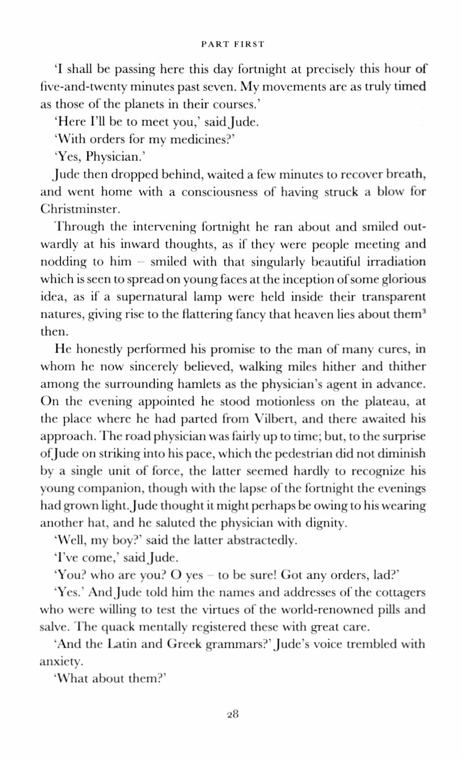 Jude Fawley, the stonemason excluded not by his wits but by poverty from the world of Christminster privilege, finds fulfilment in his relationship with Sue Bridehead. Both have left earlier marriages. Ironically, when tragedy tests their union it is Sue, the modern emancipated woman, who proves unequal to the challenge. Hardy's fearless exploration of sexual and social relationships and his prophetic critique of marriage scandalised the late Victorian establishment and marked the end of his career as a novelist.