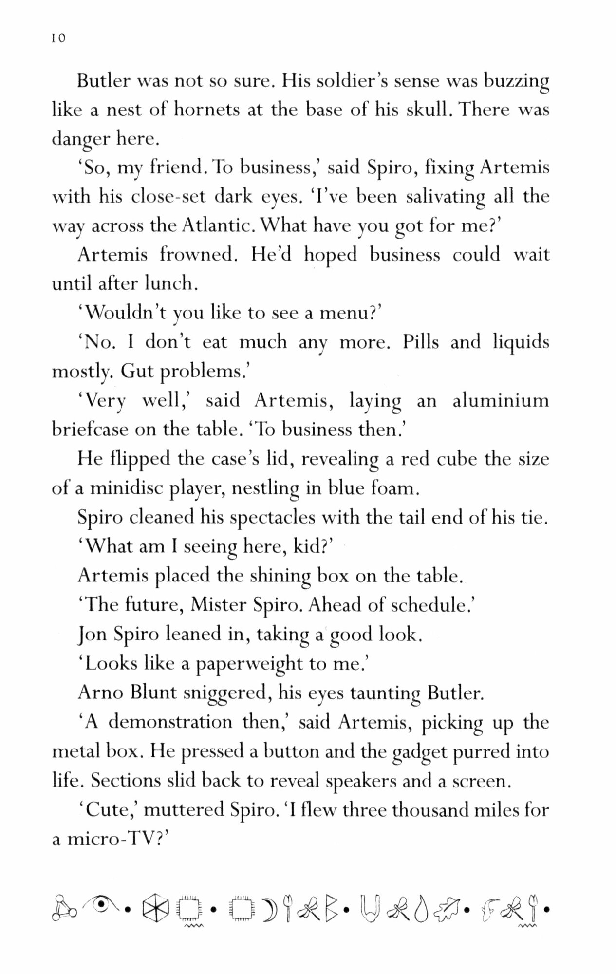 «Я никогда не говорю людям, насколько я умен. Они будут слишком напуганы». Артемис изобретает суперкомпьютер, до которого не может додуматься ни один человек, - C Cube. Он сделан по технологиям фейри – повезло, что телохранитель Артемиса конфисковал у волшебного народца всё необходимое в первой книге. Теперь, как всегда, Артемису нужна удача. Огромное состояние. Поэтому он планирует продать свое удивительное изобретение бизнесмену по имени Джон Спиро в обмен на огромное количество золота *Тут история становится более захватывающей и опасайтесь спойлеров* Спиро выманивает у него Куб, и сюжет крутится вокруг того, как Артемис пытается вернуть своё. Снова. И снова! В этой книге Артемис остался без своего телохранителя, который получил смертельное ранение. Артемис остается один и вынужден объединиться с фейри (у тех тоже свой интерес, Куб для них опасен). Четвертая книга будет очень интересной. Я знаю это!