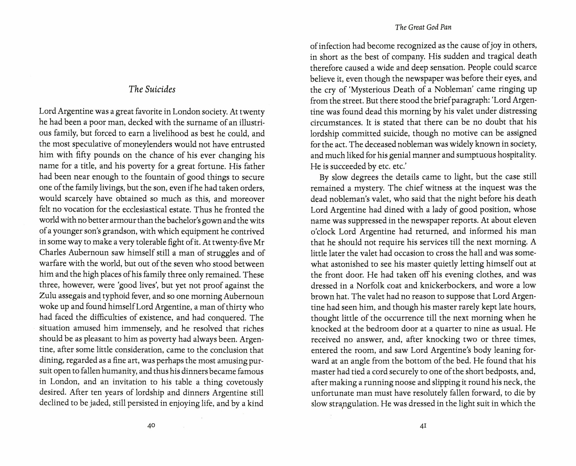 Причина, по которой Мейчен остается влиятельным среди современных писателей ужасов, хорошо видна в его самой известной повести "Великий бог Пан". Хотя эта повесть не столь шокирующая и декадентская, как о ней отзывались современные критики, она все же весьма тревожная, поскольку Мейчен рассказывает эту историю о злых соблазнах и скрытых божествах. Мейчен, по-видимому, проявлял большой интерес к мистике (он общался с Алистером Кроули) и имел сильные пантеистические наклонности. Но если современник Элджернон Блэквуд писал о тех же местах с чувством жуткого благоговения, то Мейчен наполняет их предчувствием и напряжением. Обязательно к прочтению для любителей ужасов.