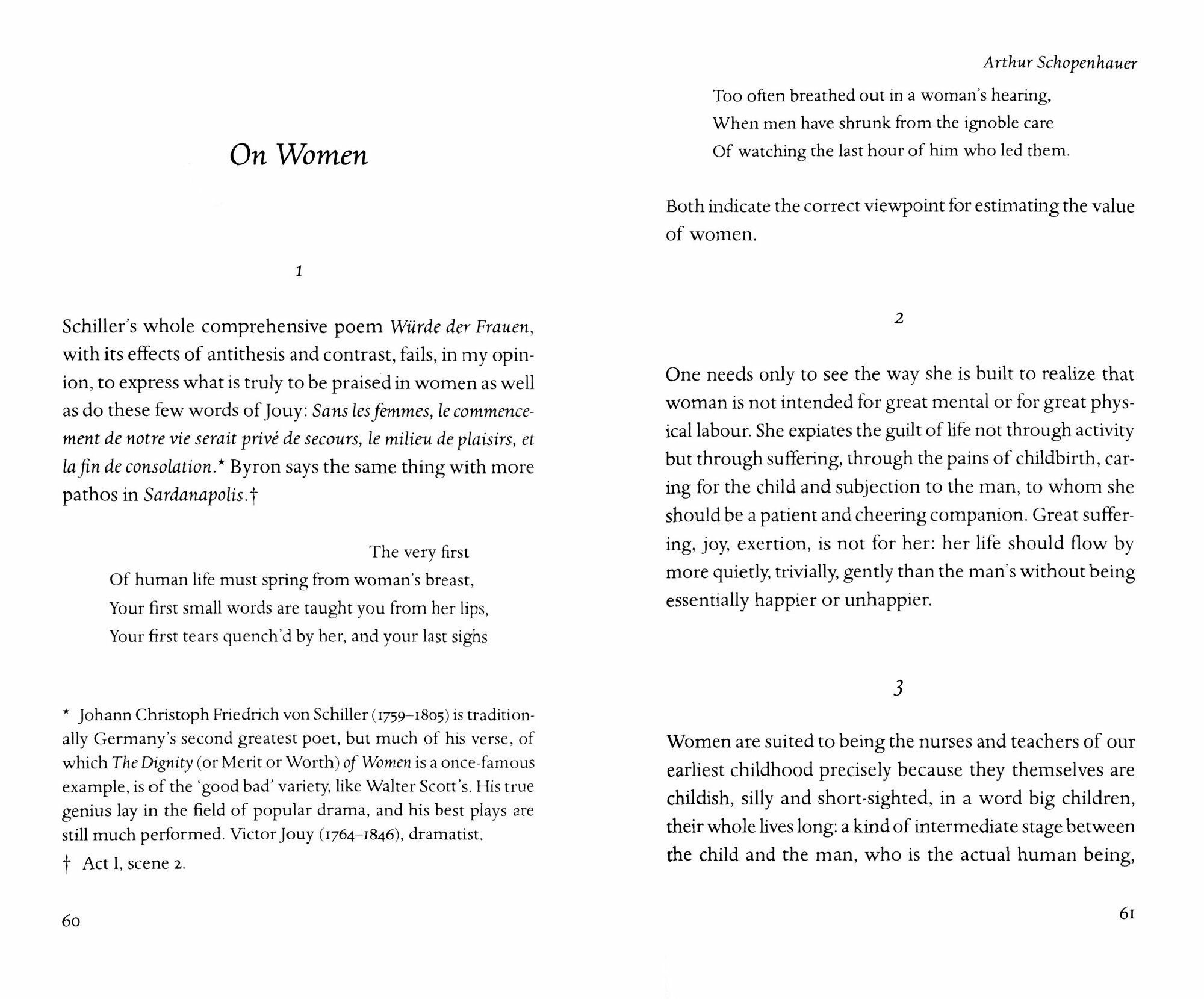 Arthur Schopenhauer was born in Danzig in 1788 where his family, of Dutch origin, owned a respected trading house. Arthur was expected to inherit the business, but hated the work and in 1807, after his father's suicide and the sale of the business, he enrolled in the grammar school at Gotha. He went on to study medicine and science at Gottingen University and in 1810 began to study philosophy. In 1811 he transferred to Berlin to write his doctoral thesis, and began to write The World as Will and Idea, a complete exploration of his philosophy, which was finished in 1818. Although the book failed to sell, his belief in his own views sustained him through twenty-five years of frustrated desire for fame. During his middle life he travelled widely in Europe and in 1844 brought out a much expanded edition of his book, which after his death became one of the most widely read of all philosophical works. His fame was established in 1851 with the publication of Parerga and Paralipomena, a collection of dialogues, essays and aphorisms. He died in 1860.