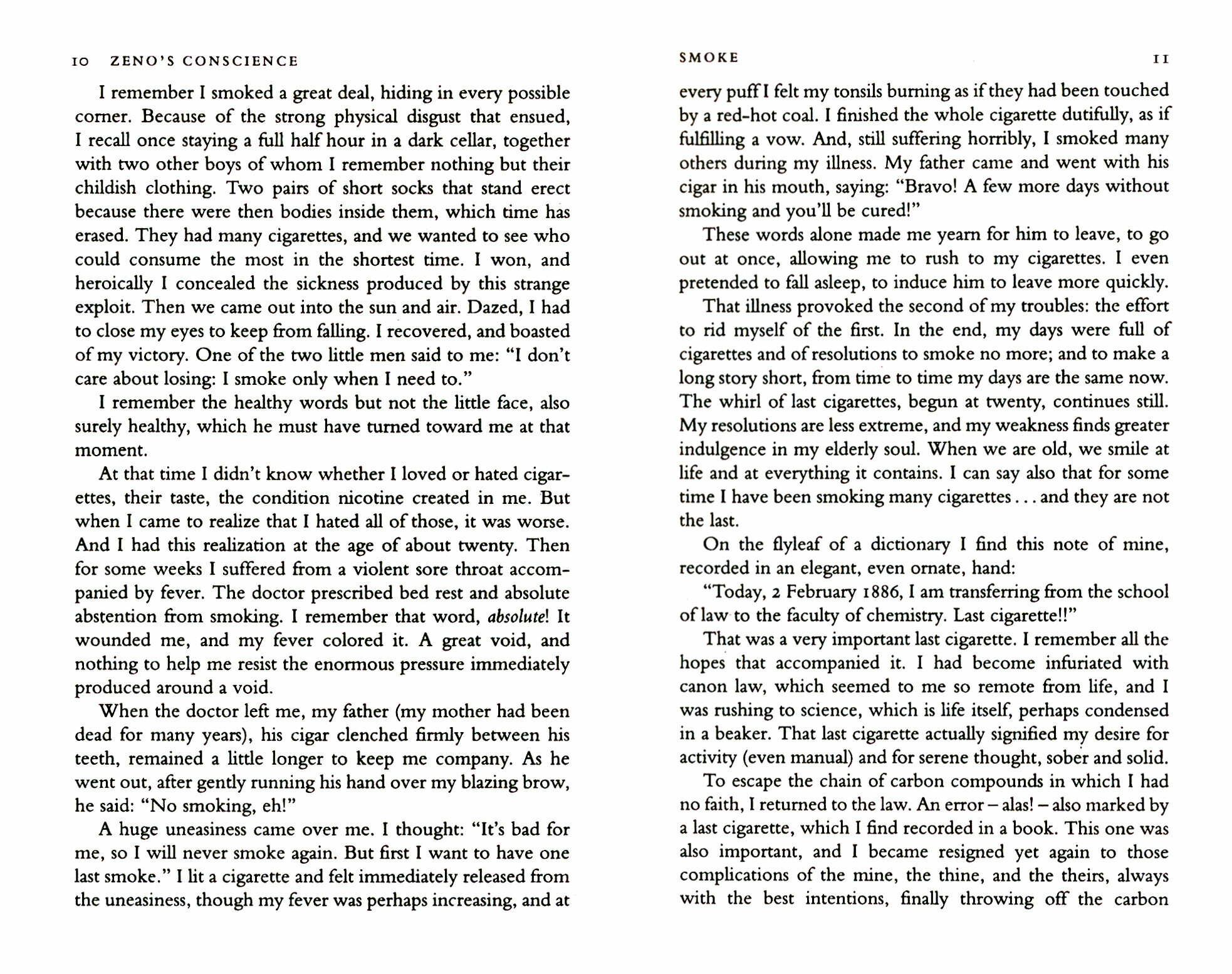 With cigarette in hand, Zeno sets out in search of health and happiness, hoping along the way to free himself from countless vices, not least of which is his accursed "last cigarette!" (Zeno's famously ineffectual refrain is inevitably followed by a lapse in resolve.)