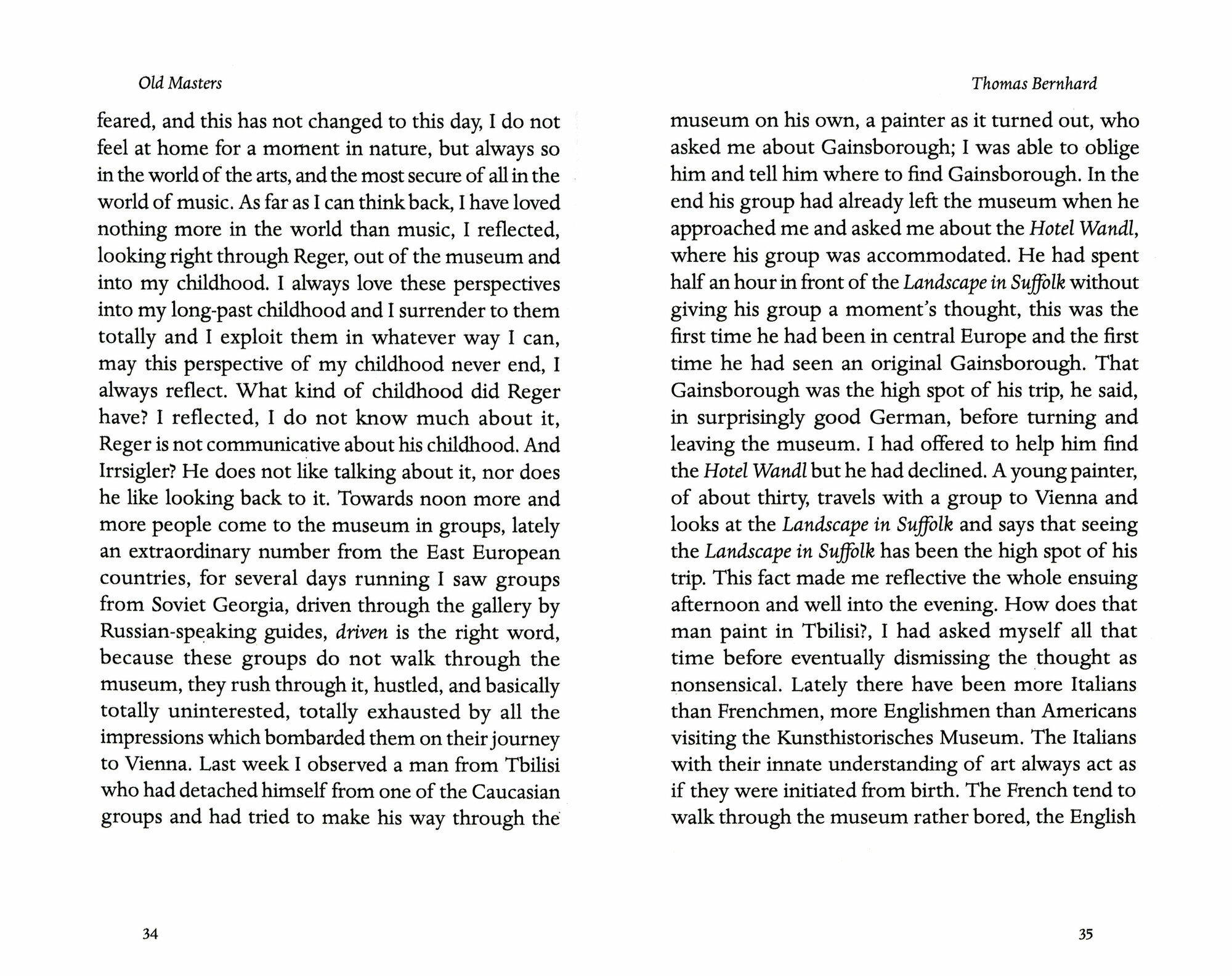 For over thirty years Reger, a music critic, has sat on the same bench in front of a Tintoretto painting in a Viennese museum, thinking and railing against contemporary society, his fellow men, artists, the weather, even the state of public lavatories. His friend Atzbacher has been summoned to meet him, and through his eyes we learn more about Reger - the tragic death of his wife, his thoughts of suicide and, eventually, the true purpose of their appointment. At once pessimistic and exuberant, rancorous and hilarious, Old Masters is a richly satirical portrait of culture, genius, nationhood, class, the value of art and the pretensions of humanity.