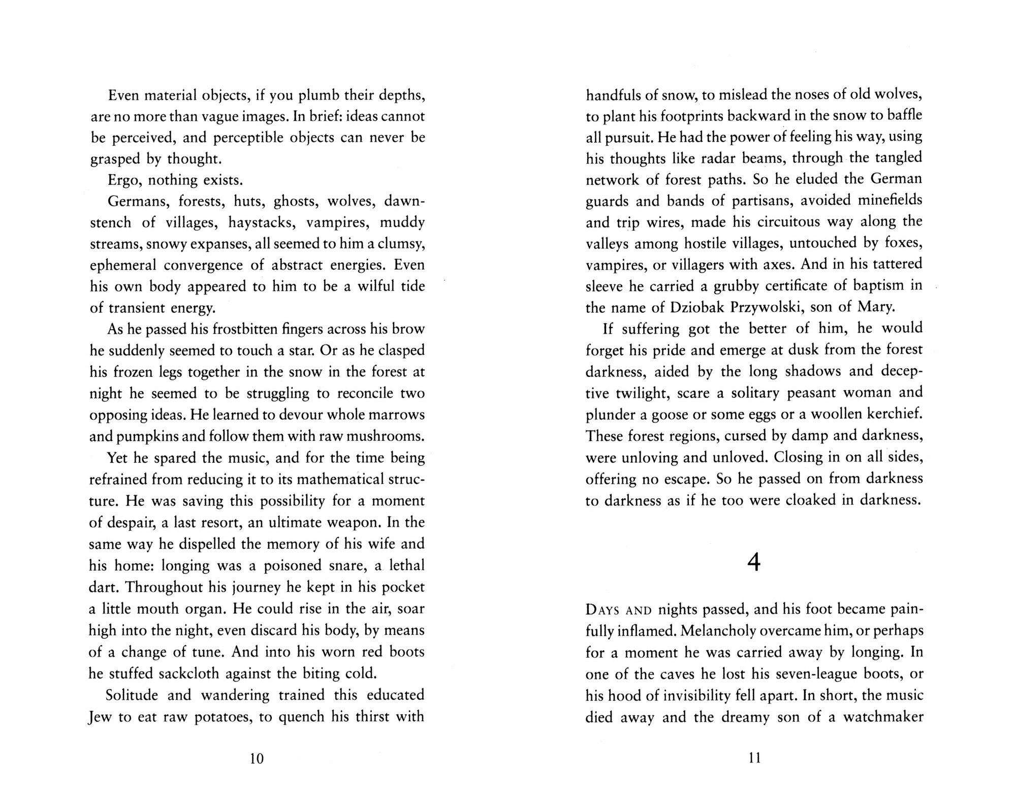 As the Germans advance into Poland in 1939, Elisha Pomeranz, a Jewish mathematician and watchmaker, escapes into the wintry forest, leaving behind his beautiful, intelligent wife, Stefa.