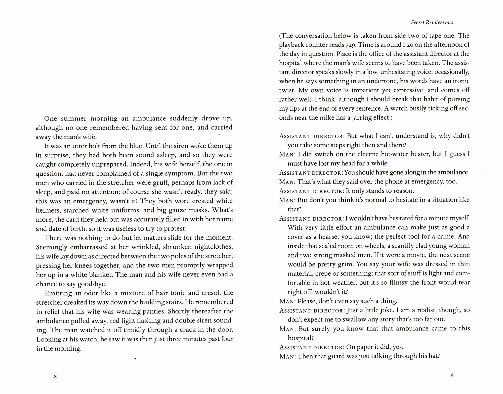 It is 4am when the ambulance comes to take the man's wife away - although no-one has called it, and there is nothing wrong with her. As he sets out to find her, he finds himself in the corridors of a vast underground hospital, where he encounters sinister medics, freakish sexual experiments and the unmistakable feeling of being watched. Even when he is suddenly appointed as the hospital's chief of security, reporting to a man who thinks he is a horse, he will not give up his search. Secret Rendezvous is a nightmarish satire of bureaucracy, medicine and modern life.