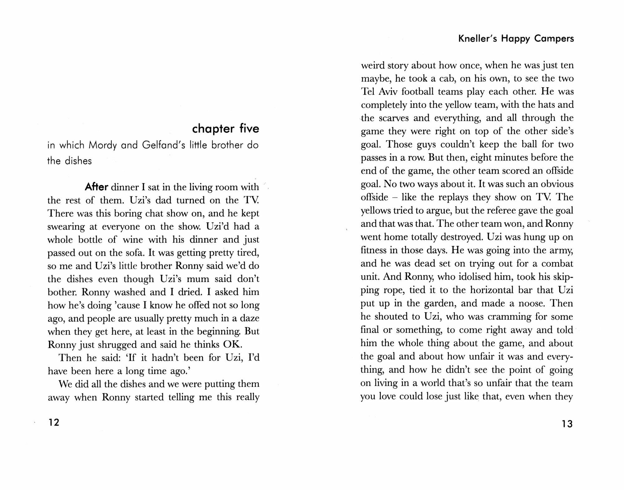 Kneller's Happy Campers is a strange, dark but funny tale set in a world very much like our own but it's an afterlife populated by people who have killed themselves - many of them are young, and most of them bear the marks of their death... bullet wounds, broken necks...(those who have over-dosed are known as 'Juliets').