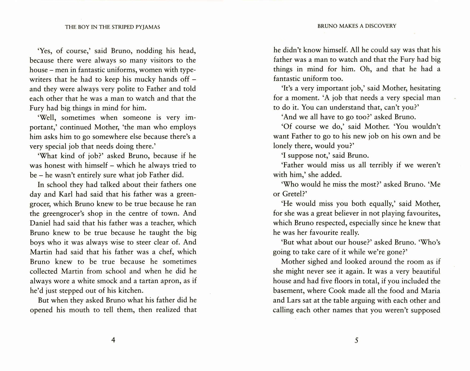 Nine-year-old Bruno knows nothing of the Final Solution and the Holocaust. He is oblivious to the appalling cruelties being inflicted on the people of Europe by his country.All he knows is that he has been moved from a comfortable home in Berlin to a house in a desolate area where there is nothing to do and no-one to play with. Until he meets Shmuel, a boy who lives a strange parallel existence on the other side of the adjoining wire fence and who, like the other people there, wears a uniform of striped pyjamas.