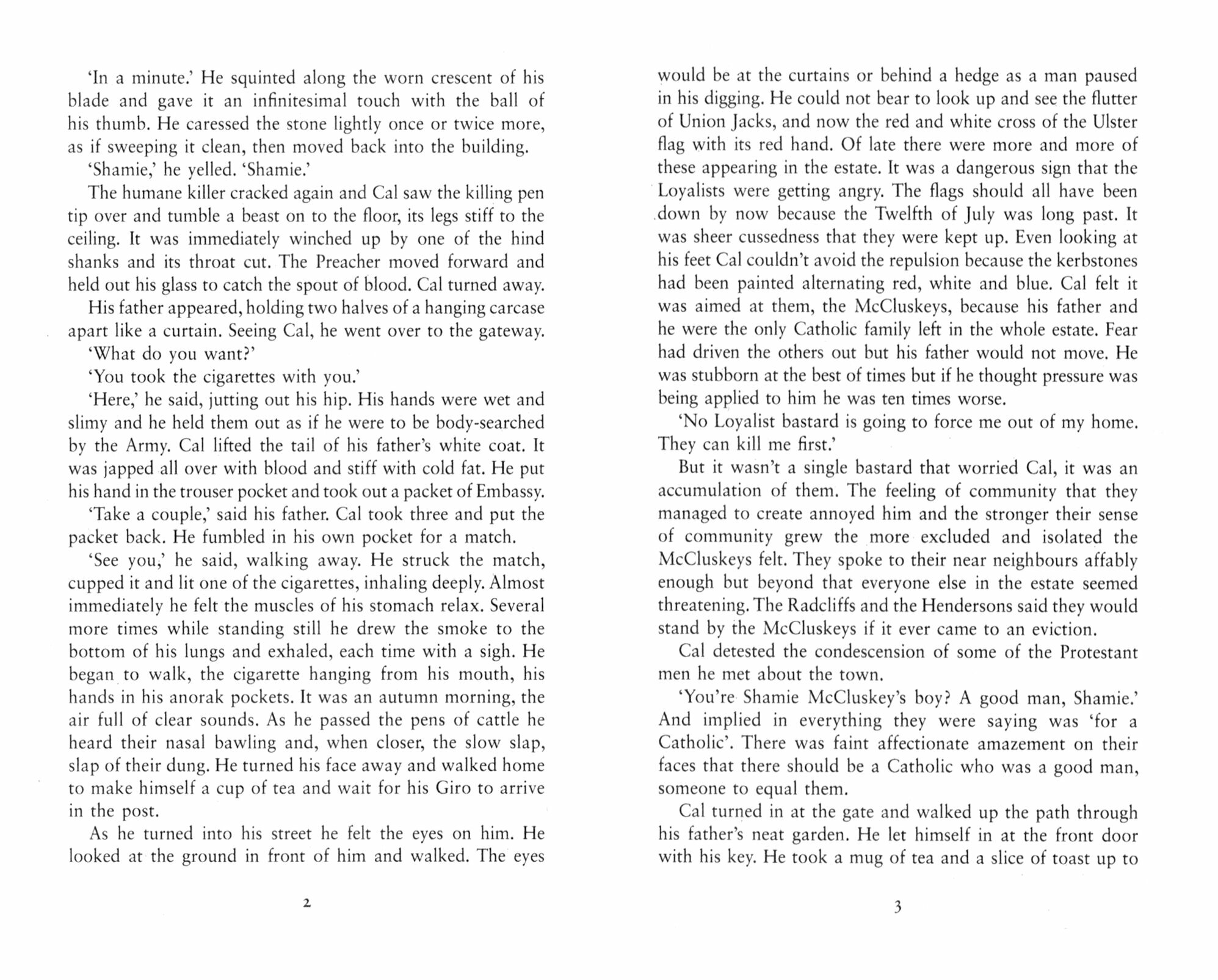 Set in the Northern Ireland of the 1980s, Cal tells the story of a young Catholic man living in a Protestant area. For Cal, some choices are devastatingly simple: he can work in an abattoir that nauseates him or join the dole queue; he can brood on his past or plan a future with Marcella.