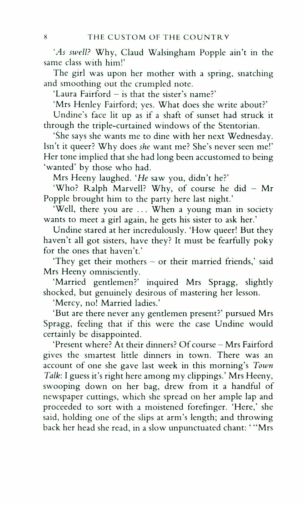 The Custom of the Country is probably Edith Wharton's most savage satire on the manners of late nineteenth-century America. It is the story of the exquisitely beautiful but brutally ambitious Undine Spragg who marries her way into the high aristocracy of Europe, abandoning several husbands along the way. This novel, which has scences of comedy and even farce, is a commentary on both certain aspects of feminisim and certain aspects of capitalism in Edith Wharton's time. The novel makes a fitting companion to The Age of Innocence and The House of Mirth and shows Wharton to be one of the greatest American novelists.