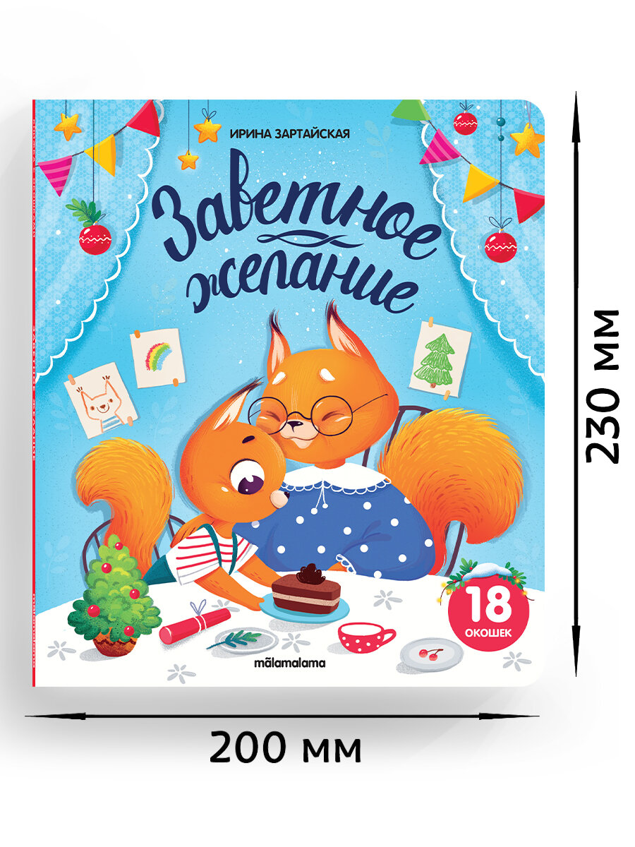 Удивительная и трогательная история Ирины Зартайской «Заветное желание» о крошке Бельчонке, который очень хотел получить много подарков на самый любимый праздник в году. Что же попросить у Дедушки Мороза? Новые коньки? Санки? Рюкзак? А может... что-то гораздо более важное? Читайте историю крошки Бельчонка, готовьтесь вместе с ним к Новому году, и открывайте для себя своё самое заветное желание. Яркие добрые иллюстрации, большие красочные окошки, новогодняя атмосфера и праздничное настроение — в книжке с окошками от торговой марки Malamalama!