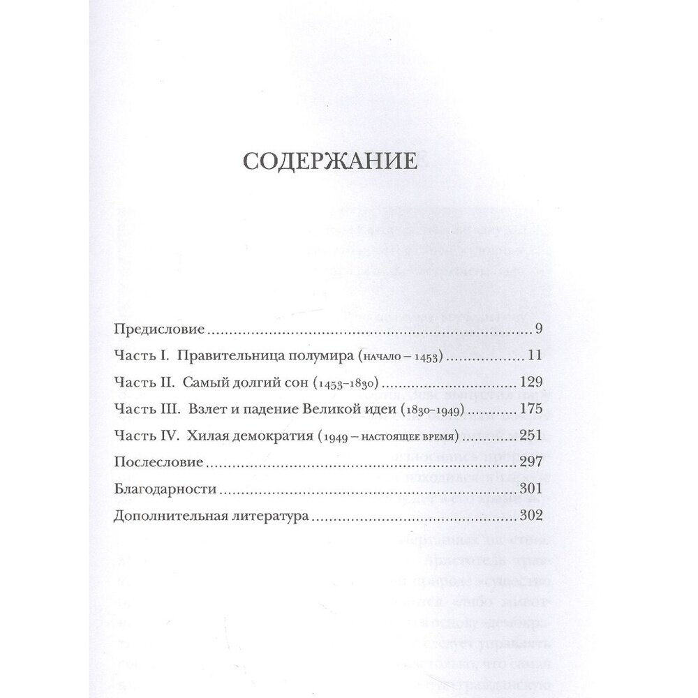 Следуя четкой хронологии, Джеймс Хенидж кратко и крупными мазками рисует историю Греции. Первая часть книги посвящена периоду от самой древности до 1453 года - это время автор называет "правлением половиной мира". В 1453 году Греция потеряла свою независимость и вошла в состав Османской империи, так что вторая часть охватывает временной отрезок почти в четыре сотни лет, который автор называет "самым долгим сном" нации. 1830-й, год полного пробуждения от этого "сна", стал датой провозглашения и окончательного признания независимости королевства Греция. В третьей части описана история современной Греции до 1949 года (правление Оттона, Георга I, революция и Гражданская война в России, Первая и Вторая мировые войны и гражданская война в Греции). В четвертой части освещаются события с 1949 по 2020 год.
