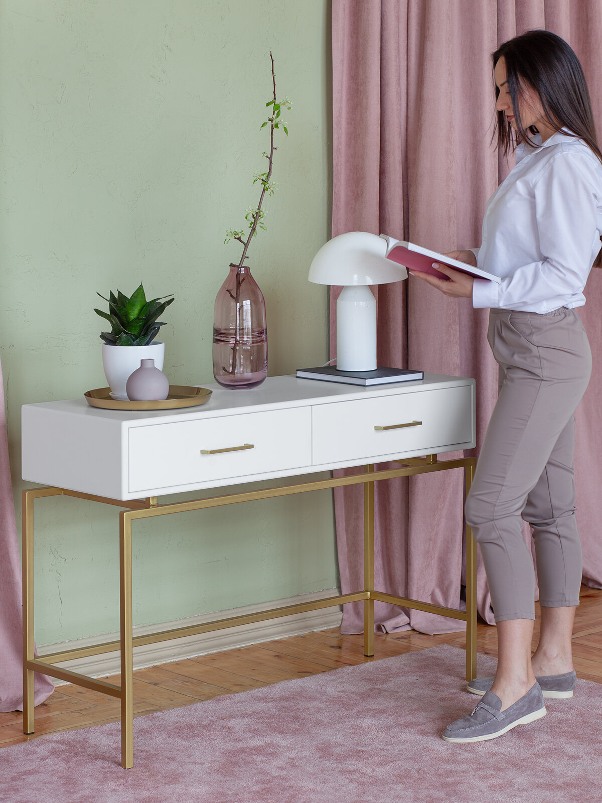 Консоль KARIN с золотым каркасом и полкой из МДФ подойдет для зонирования гостиной, спальни и входной зоны. Стильная консоль в прихожую дополнит современный интерьер квартиры, загородного дома, офиса, студии и салона. Консоль KARIN популярна у дизайнеров для создания интерьеров в стиле лофт, минимализм и сканди. Консоль можно использовать как туалетный столик, место для хранения аксессуаров и декора. Консоль KARIN отлично сочетается со стеллажами KARIN и пуфами CHELSEA. Может служить как туалетным столиком в спальне, так и тумбой для прихожей или гостиной. Элегантная модель консоли с корпусом из МДФ и двумя ящиками, оснащенными доводчиками, что обеспечивает плавное и бесшумное открывание и закрывание. Каркас изготовлен из профильной трубы 20 х 20 мм с полимерным покрытием порошковой краской. Качественное покрытие стали гарантирует устойчивость к повреждениям и долгий срок службы мебели. Полка консоли выполнена из МДФ толщиной 8 мм, выдерживает нагрузку до 10 кг. Напольная консоль не требует дополнительного крепления к стене, устойчива за счет собственного веса. Собственное производство обеспечивает надежность и эстетику сварных швов металлической мебели. Консоль доставляем в собранном виде в надежной упаковке."