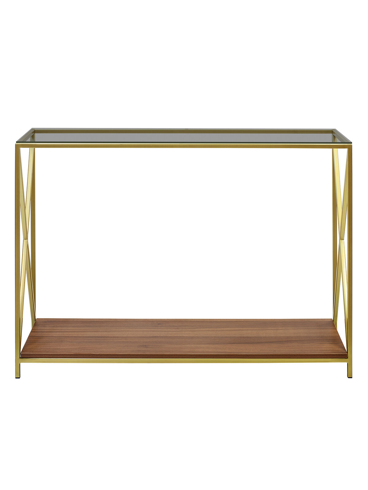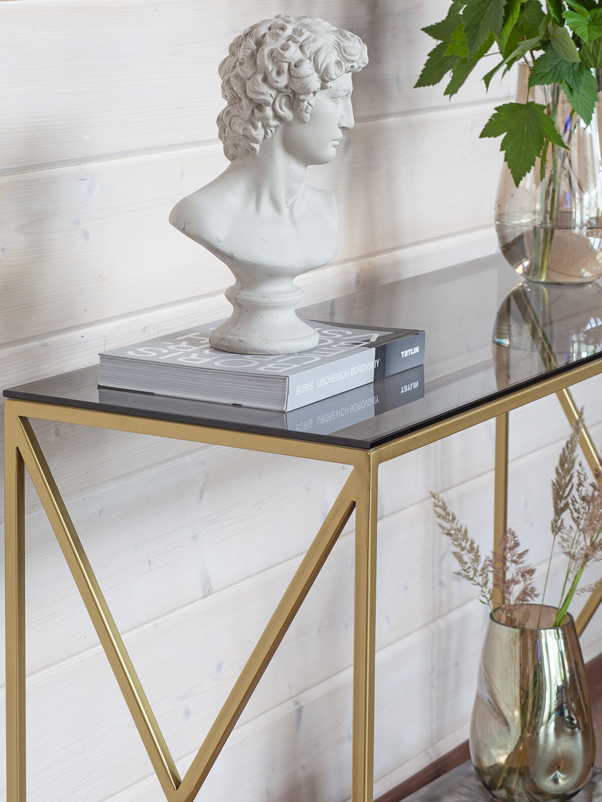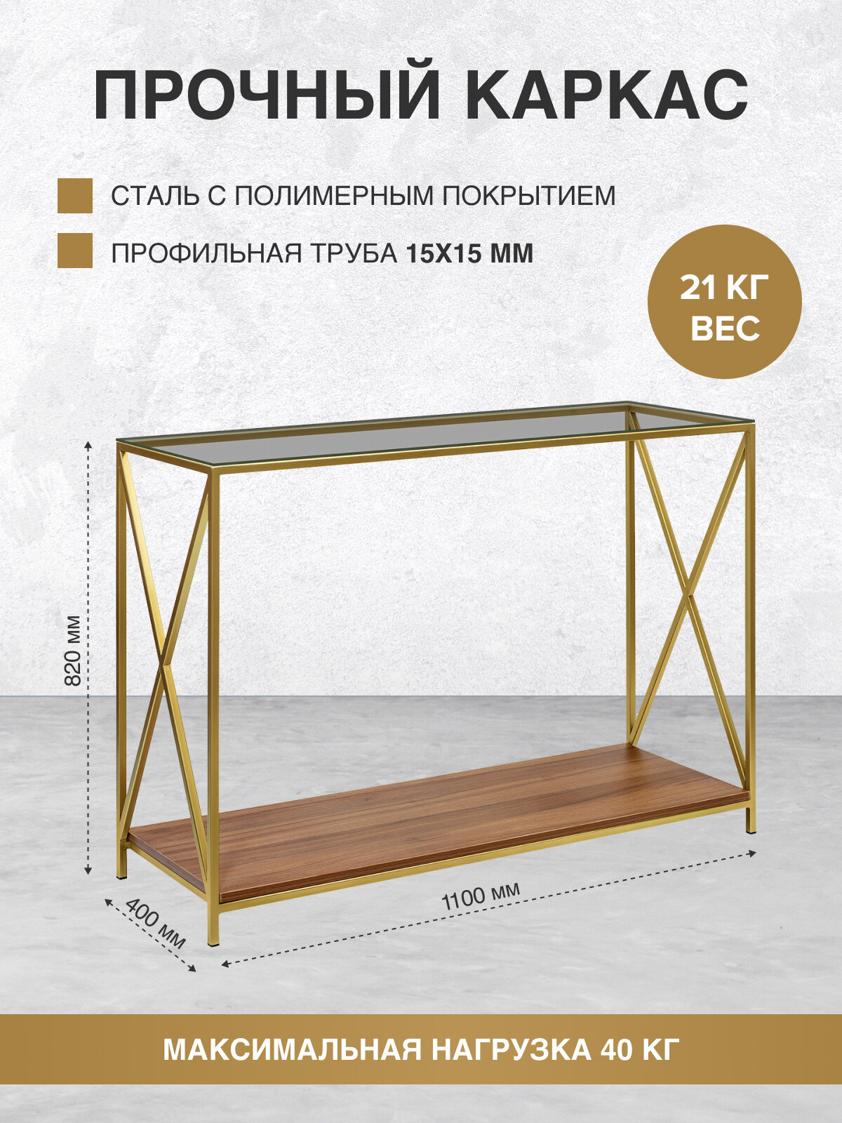 Стол-консоль GARDA с золотым каркасом и двумя столешницами подойдет для зонирования гостиной, спальни и входной зоны. Стильная консоль в прихожую дополнит современный интерьер квартиры, загородного дома, офиса, студии и салона. Консоль GARDA популярна у дизайнеров для создания интерьеров в стиле лофт, минимализм и сканди. Консоль можно использовать как туалетный столик, место для хранения аксессуаров и декора. Консоль GARDA отлично сочетается со стеллажами LOFT и обувницами GARDA. Верхняя столешница из каленого тонированного стекла толщиной 8 мм и нижняя из ЛДСП Egger выгодно сочетают в себе удобство и комфорт, а также прекрасно дополняют друг друга по цветовому решению. Каркас изготовлен из профильной трубы 15 х 15 мм с полимерным покрытием порошковой краской. Качественное покрытие стали гарантирует устойчивость к повреждениям и долгий срок службы мебели. Полка консоли выполнена из ЛДСП толщиной 8 мм, выдерживает нагрузку до 10 кг. Напольная консоль не требует дополнительного крепления к стене, устойчива за счет собственного веса. Собственное производство обеспечивает надежность и эстетику сварных швов металлической мебели. Консоль доставляем в собранном виде в надежной упаковке.