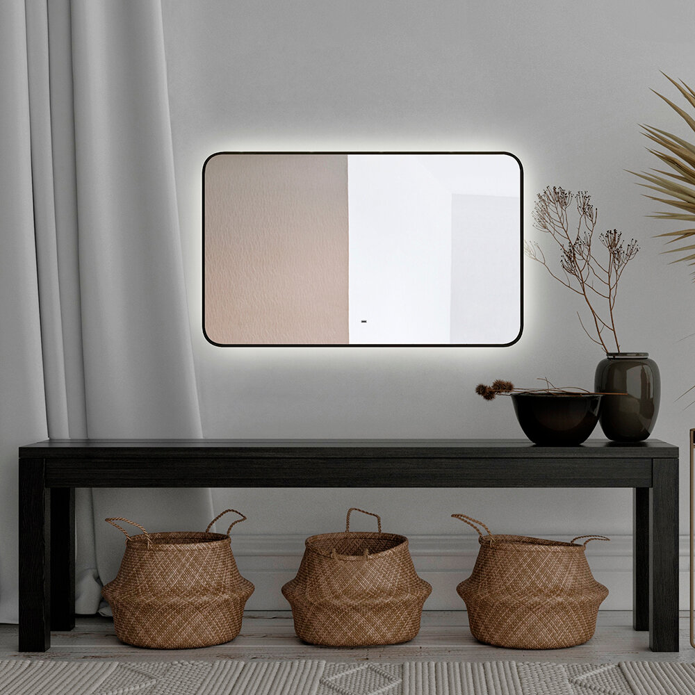 Зеркало лаконичной формы с матированной кромкой черного цвета. Модель сделана из стекла высшего качества M0 (влагостойкое, минимальные оптические искажения). Ореольная подсветка подчеркивает форму зеркала и создает эффект парения. Подсветка активируется на взмах руки в 3-5 см от сенсора, расположенного на зеркальном полотне. Экологически чистый продукт выполненный по стандартам ЕС. Оснащение: бесконтактный сенсор, диммер, крепления