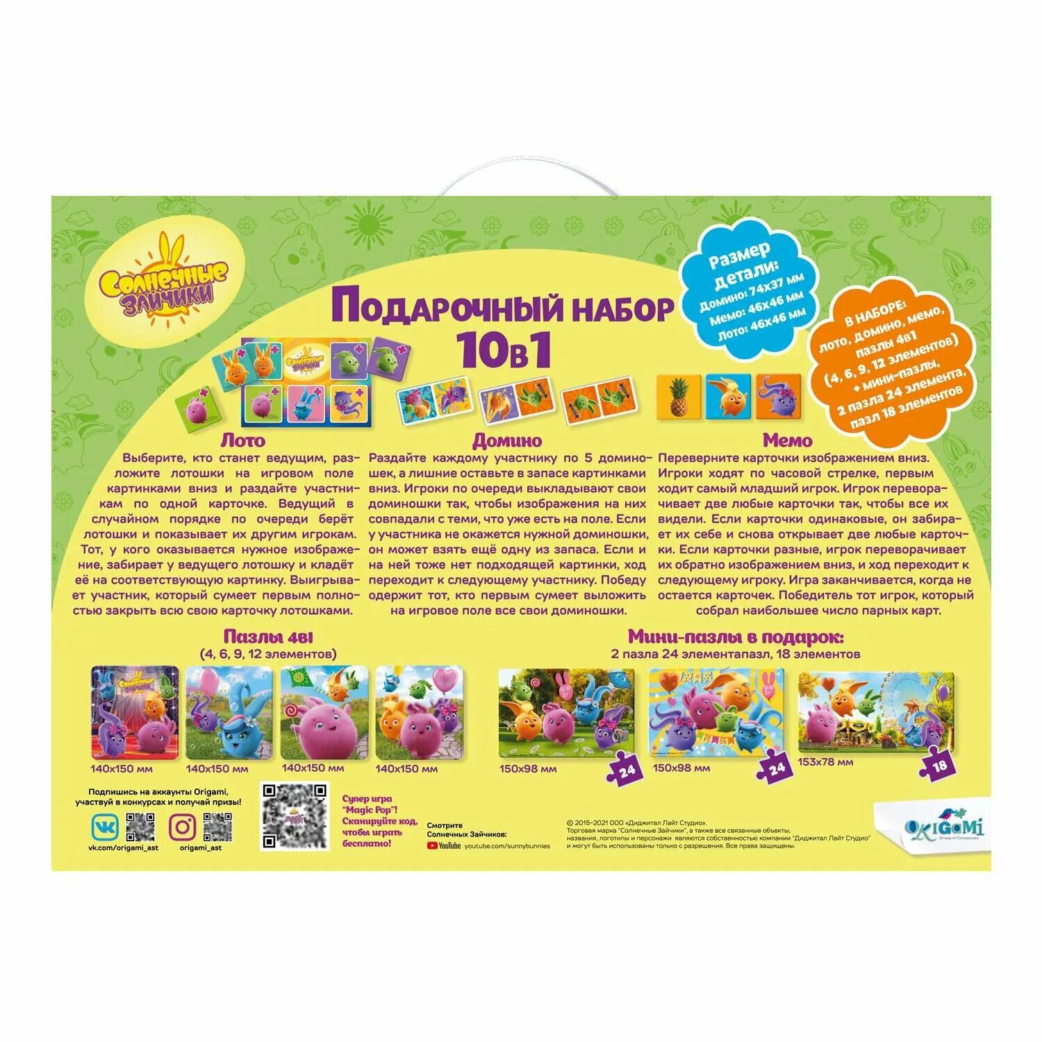 Подарочный набор 10в1 - это идеальная система развлечений для вашего малыша. Мы включили в него все самое лучшее - интересные и полезные игры (лото, домино и мемо), а также 7 ярких пазлов с красивыми картинками. Лото, домино и мемо позволят надолго занять малыша и в игровой форме потренируют его память, логику и внимательность. Сборка красочных пазлов поможет улучшить мелкую моторику рук и развить пространственное мышление. Развивайтесь вместе с нами!