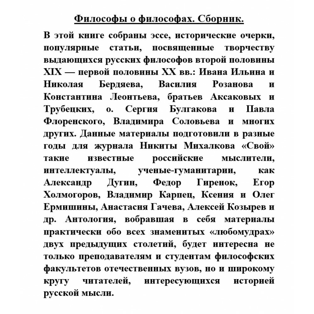 В этой книге собраны эссе, исторические очерки, популярные статьи, посвященные творчеству выдающихся русских философов второй половины XIX — первой половины XX вв.: Ивана Ильина и Николая Бердяева, Василия Розанова и Константина Леонтьева, братьев Аксаковых и Трубецких, о. Сергия Булгакова и Павла Флоренского, Владимира Соловьева и многих других. Данные материалы подготовили в разные годы для журнала Никиты Михалкова «Свой» такие известные российские мыслители, интеллектуалы, ученые-гуманитарии, как Александр Дугин, Федор Гиренок, Егор Холмогоров, Владимир Карпец, Ксения и Олег Ермишины, Анастасия Гачева, Алексей Козырев и др. Антология, вобравшая в себя материалы практически обо всех знаменитых «любомудрах» двух предыдущих столетий, будет интересна не только преподавателям и студентам философских факультетов отечественных вузов, но и широкому кругу читателей, интересующихся историей русской мысли.