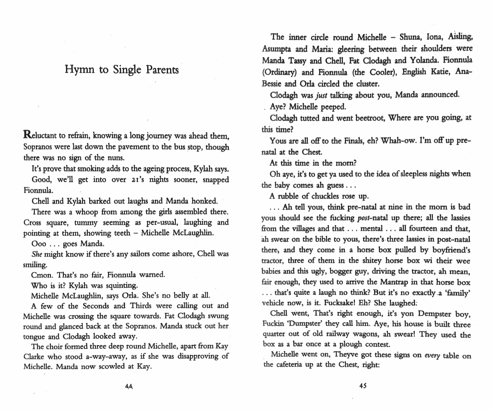 The choir from Our Lady of Perpetual Succour School for Girls is being bussed to the national finals in the big, big city. And it's an important day for The Sopranos - Orla, Kylah, (Ra)Chell, Amanda Konky and Fionnula (the Cooler) - pub-crawling, shoplifting and body-piercing being the top priorities. Then it's time to lose that competition - lose, because a nuclear sub has just anchored in the bay and, tonight, the Man Trap disco will be full of submariners on shore-leave. There is no time for delays. . .