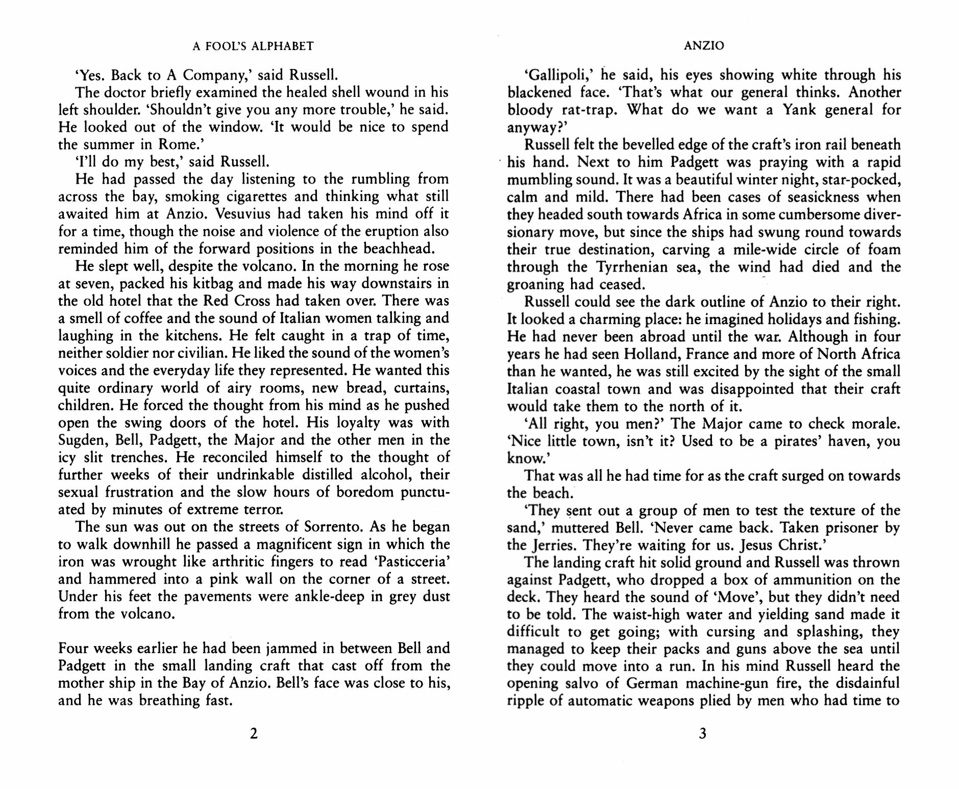 The events of Pietro Russell's life are told in 26 chapters. From A-Z each chapter is set in a different place and reveals a fragment of his story. As his memories flicker back and forth through time in his search for a resolution to the conflicts of his life, his story gradually unfolds