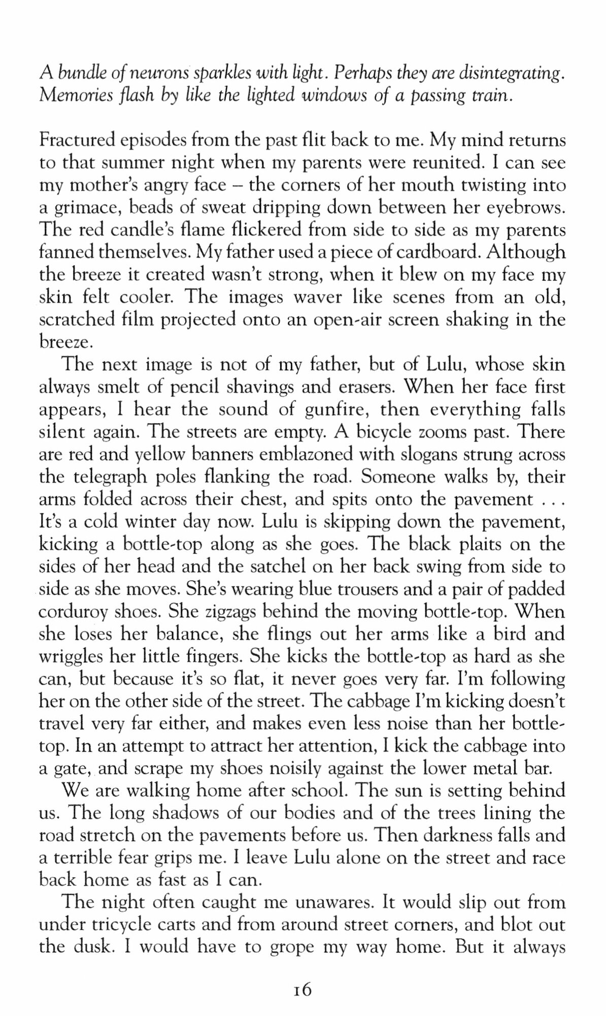 Dai Wei lies in his bedroom, a prisoner in his body, after he was shot in the head at the Tiananmen Square protest ten years earlier and left in a coma. As his mother tends to him, and his friends bring news of their lives in an almost unrecognisable China, Dai Wei escapes into his memories, weaving together the events that took him from his harsh childhood in the last years of the Cultural Revolution to his student days at Beijing University.