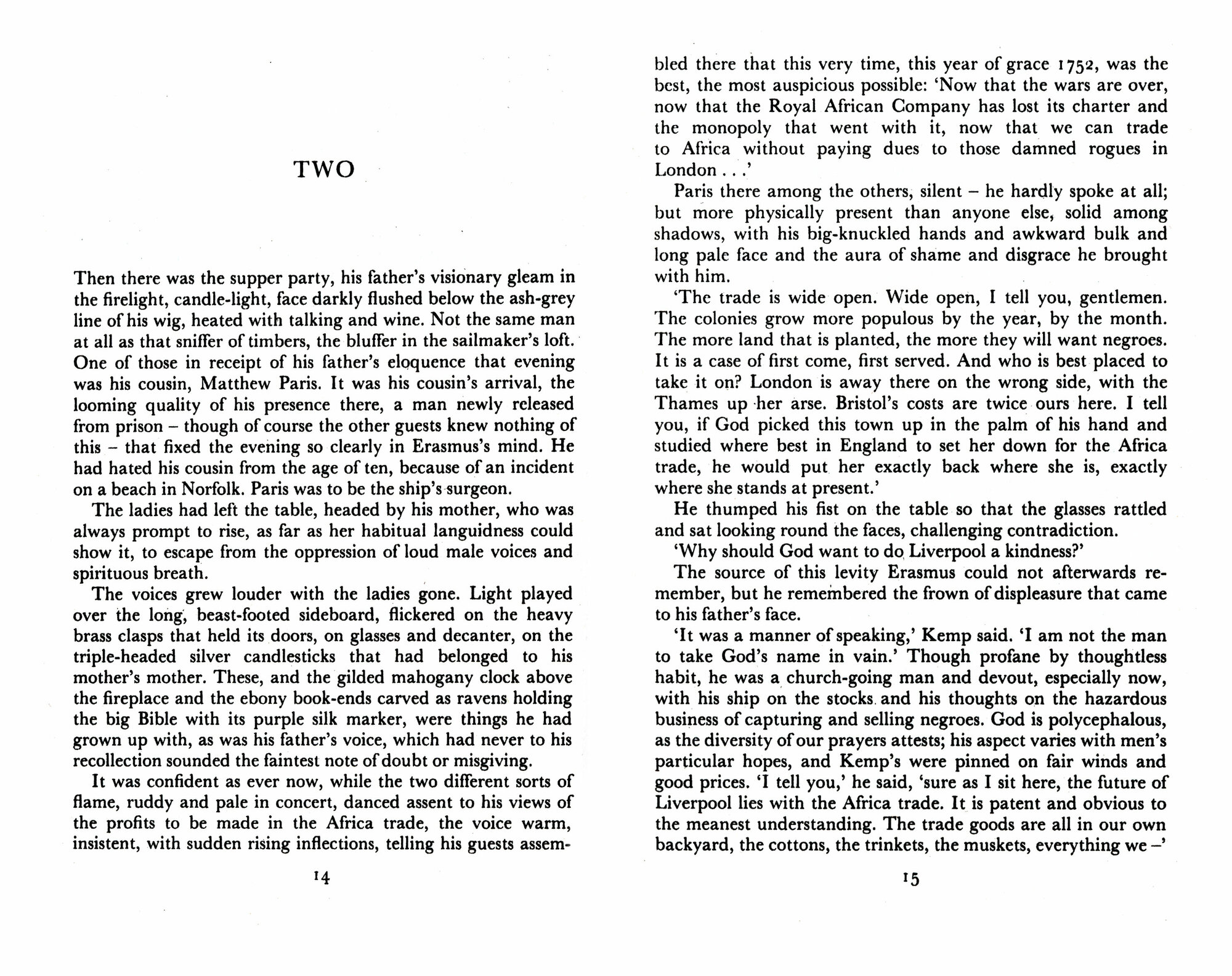 1752, the Liverpool Merchant sets sail from Merseydale. A slaver, she is bound for Africa to buy men and transport them in chains across the Atlantic. But aboard the ship disease thrives in the cramped hold, killing men and eating into profit. Captain Thruso insists on throwing the sick overboard - the the horror of Matthew Paris, ship's surgeon, who determines to prevent such barbarity. Meanwhile, back home, Erasmus Kemp, cousin of Paris and son of the Liverpool Merchant's owner, finds his fortune hanging in the balance: depending on the success or failure of a single voyage.