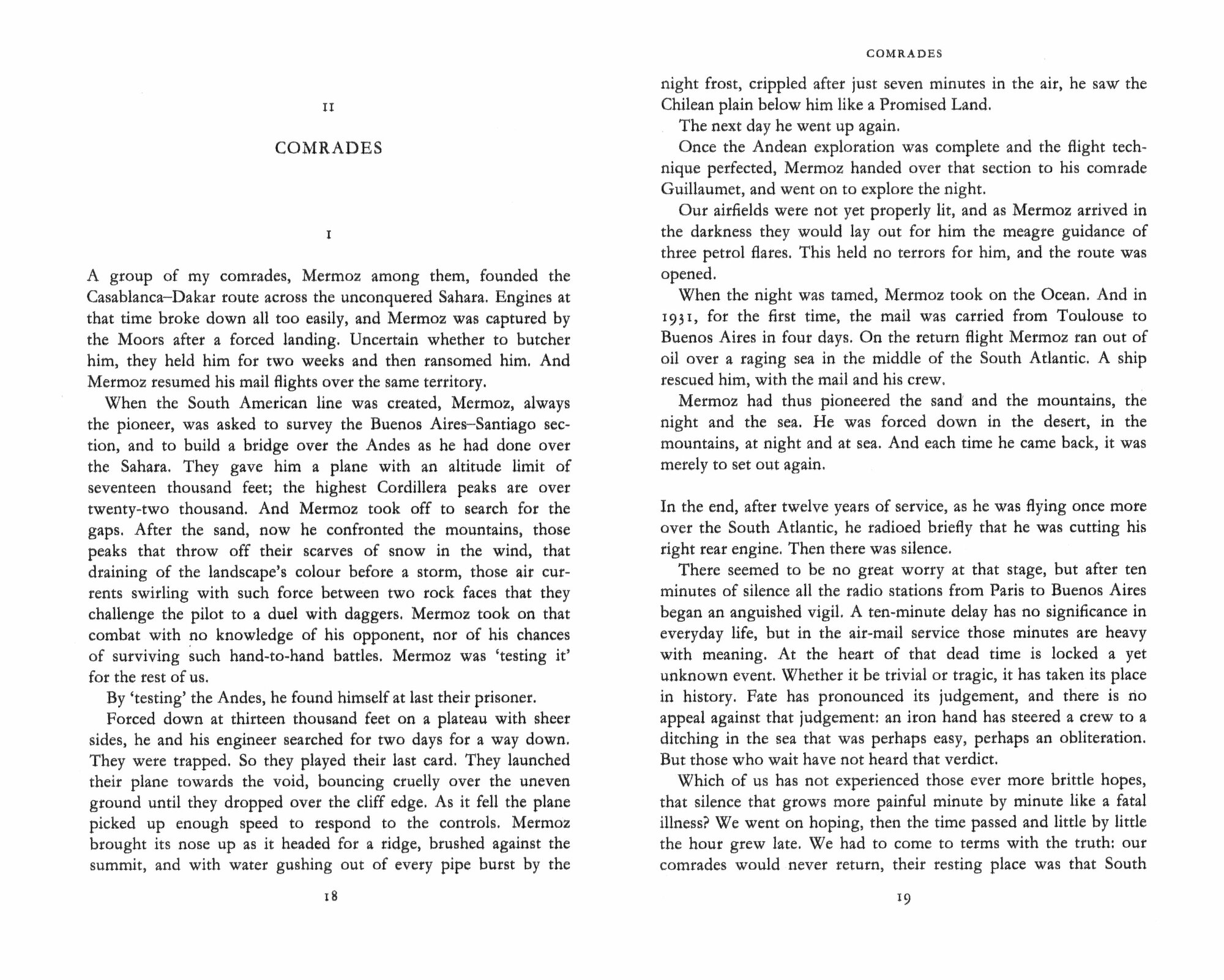 In 1926 de Saint-Exupery began flying for the pioneering airline Latecoere - later known as Aeropostale - opening up the first mail routes across the Sahara and the Andes. Wind, Sand and Stars is drawn from this experience. Interweaving encounters with nomadic Arabs and other adventures into a richly textured autobiographical narrative, it has its climax in the extraordinary story of Saint-Exupery's crash in the Libyan Desert in 1936, and his miraculous survival. 'Self-discovery comes when a man measures himself against an obstacle,' writes Saint-Exupery. This book explores the transcendent perceptions that arise when life is tested to its limits.