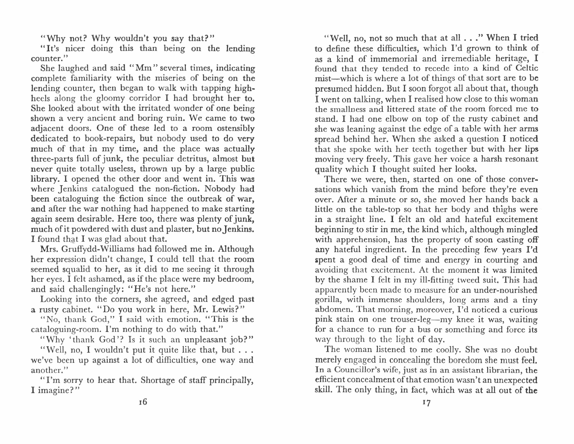 In That Uncertain Feeling by Kingsley Amis, competition is stiff for the position of sub-librarian in Aberdarcy Library. For John Lewis, the situation is complicated by the attentions of daunting and desirable village socialite, Elizabeth Gruffyd-Williams, who is married to a member of the local Council. Pursuing an affair with her whilst keeping his job prospects alive is John's predicament, as he finds himself running down Welsh country lanes at midnight in a wig and dress, resisting the advances of local drunks and suffering the long speeches of a 'nut-faced' clergyman.