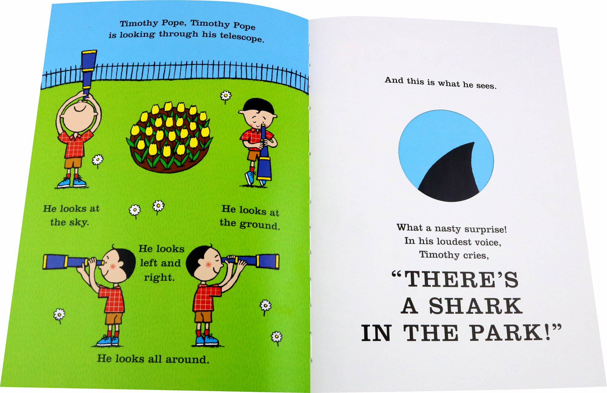 Timothy Pope has a brand new telescope and he's testing it out at the park. Peep through the die-cut holes in this book to see if you can spy a shark. Is that really a shark? Turn the page and find out . . .