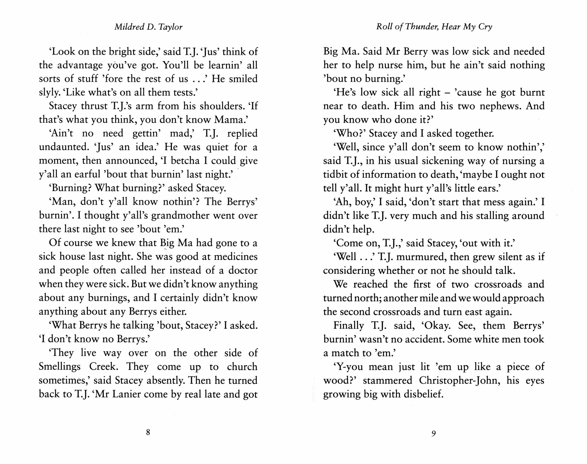 The Mississippi of the 1930s was a hard place for a black child to grow up in, but still Cassie didn't understand why farming his own land meant so much to her father. During that year, though, when the night riders were carrying hatred and destruction among her people, she learned about the great differences that divided them, and when it was worth fighting for a principle even if it brought terrible hardships.