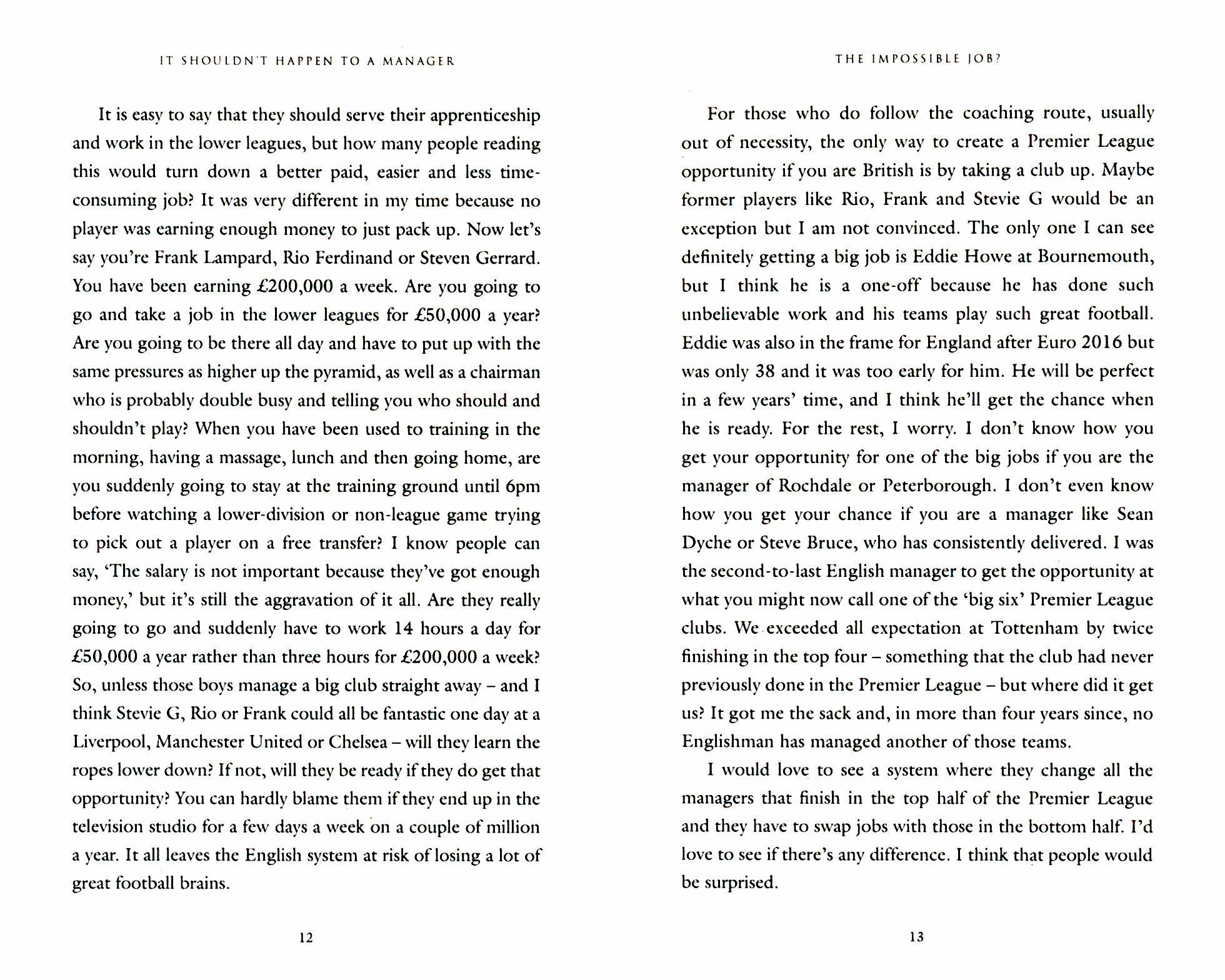 In It Shouldn’t Happen to a Manager, I talk about how different the job is now from what it was like when I used to play. For one, managers used to drive up and down motorways all day to scout for players – now there’s so much analysis and global scouting. It’s a different thing, completely. In this book, I share everything I’ve learnt from a lifetime of both wins and losses, and wisdom from greats like Cloughie and Ferguson. I’ll tell you about what actually happens in the dressing room, including when Clough smashed the door off its hinges; the bust-ups at full-time, like when I kicked a tray of sandwiches on Don Hutchinson’s head; and the times when I had to swap an arm round a player’s shoulder for a boot up the arse. It’s my guide to being a manager, the Harry way.