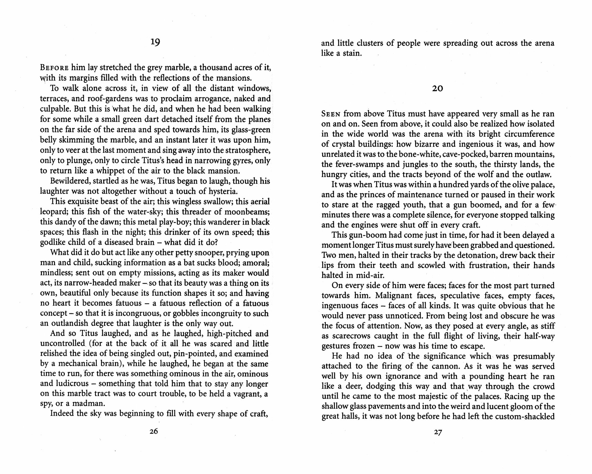 In this final part of the trilogy, we follow Titus, now almost twenty, as he escapes from the Castle, flees its oppressive Ritual, and becomes lost in a sandstorm. Helped by the owner of a travelling zoo, Muzzlehatch, and his ex-lover Juno, Titus ends up stranded in a big, bustling city. No one there having heard of Gormenghast, the general consensus is that the boy is deranged, and with no papers, he's soon arrested for vagrancy. But there are a few people who believe in his story, or at least who are intrigued by it, and they try to help him. And now Titus, the deserter, the traitor, longs for his home, and looks for it all the time to prove, if only to himself, that Gormenghast is truly real.