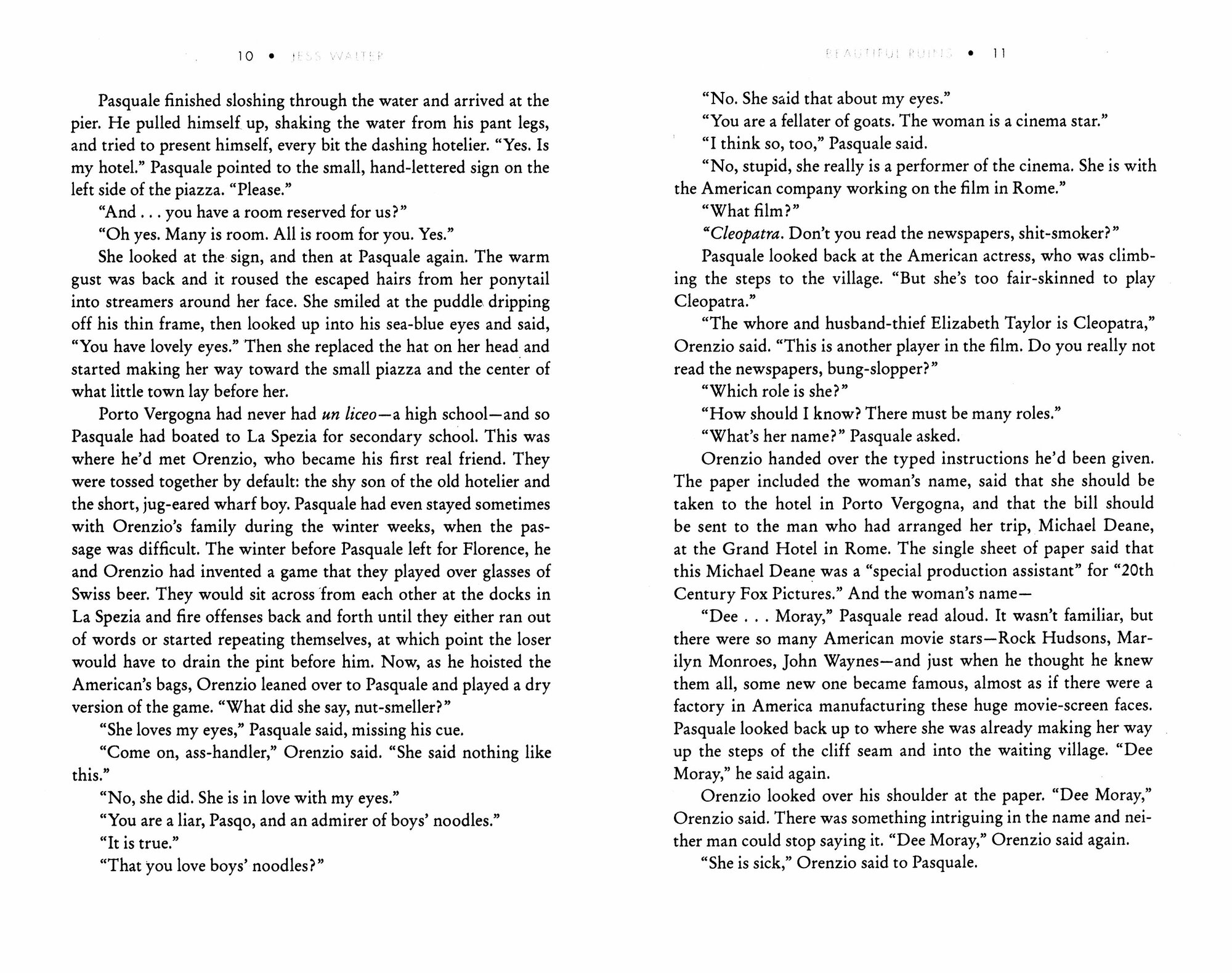 What unfolds is a dazzling novel teeming with unforgettable characters: the Italian and his long-lost love; the heroically cynical film producer who first brought them together, now a successful legend on the Hollywood scene, and his idealistic young assistant; and the husbands, wives and lovers, superstars and victims, who have populated their world since that summer day in 1962.