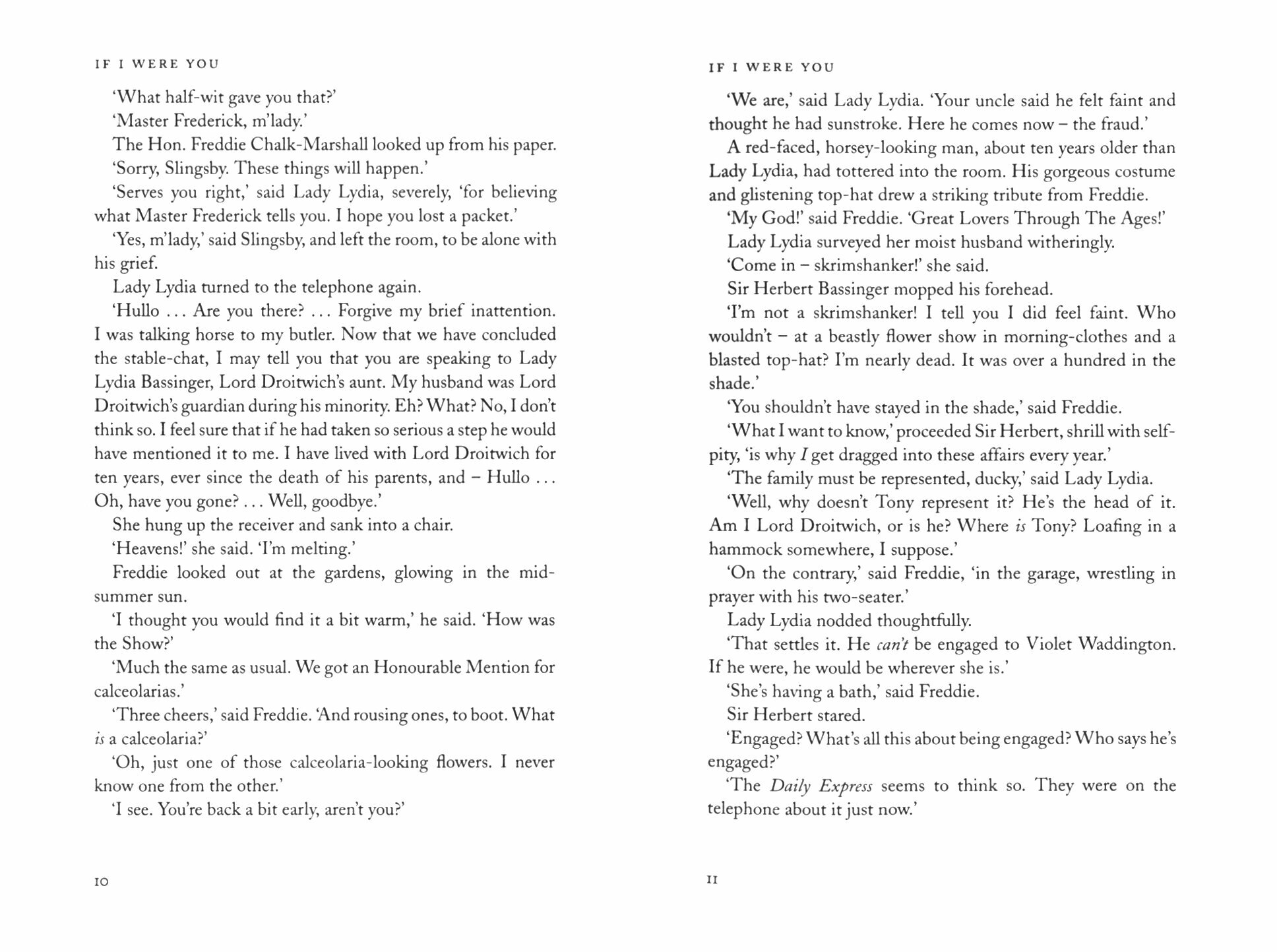 If I Were You is Wodehouse's comic variation on a favourite theme of Victorian melodrama - the changeling. Did old Nannie Price really substitute her own child for the infant son of the late Lord and Lady Droitwich while they were away in India? If so, Tony Droitwich is heir, not to rolling acres and a stately pile, but to a barber's shop in London's West End. With Socialist Syd Price determined to prove himself the new earl, and Tony's haughty relations determined that he shall not, the stage is set for an amusing battle, waged by a familiar Wodehousean cast of fat butlers, tough aunts, lively American girls and drawling dandies.