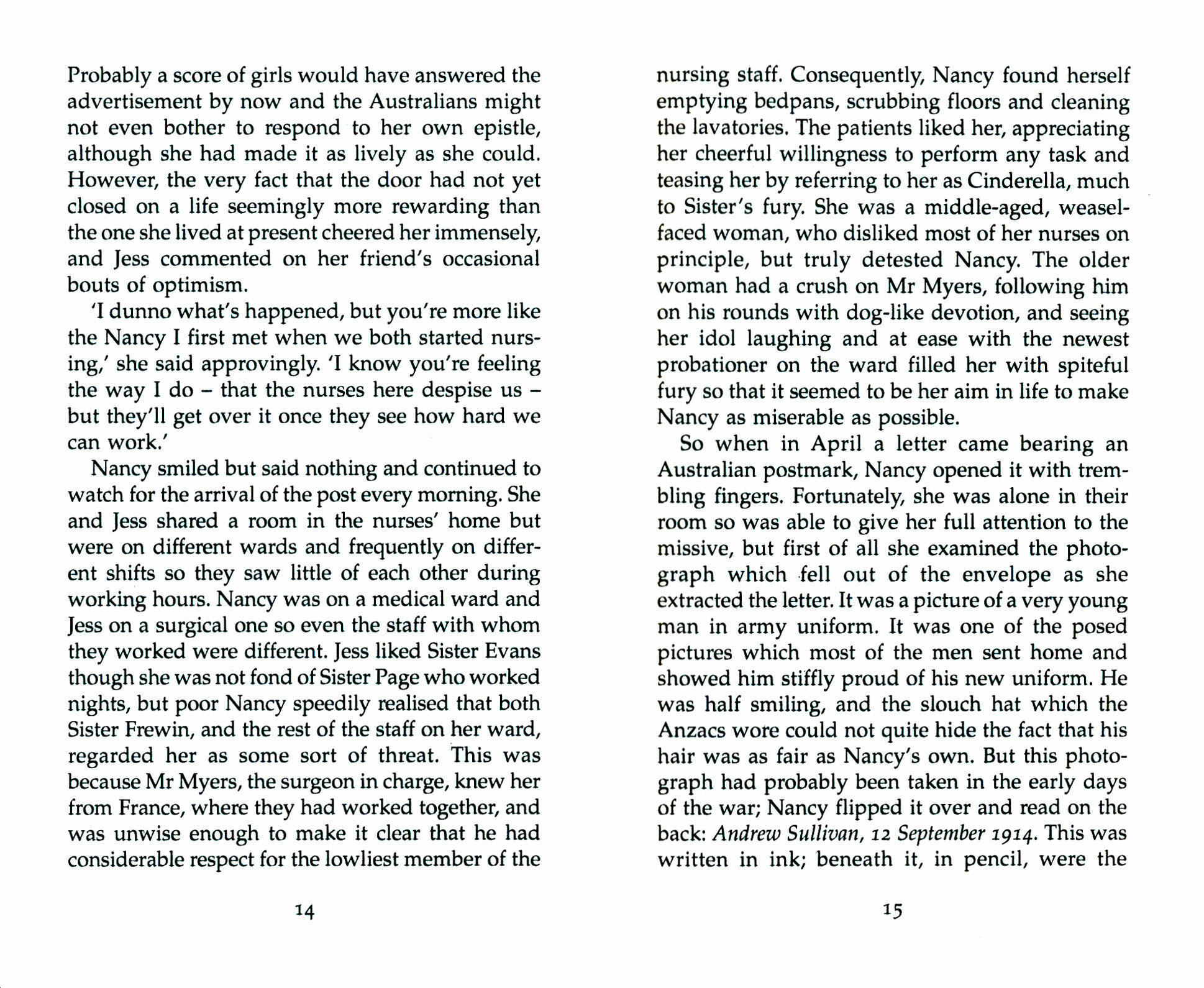 When nurses Nancy Kerris and Jess Williams both lose their lovers in the trenches during the Great War, their future in Liverpool looks bleak. As the war finally ends, their lives are set on different paths, with Nancy choosing to marry an Australian, leaving behind her life - and her friend - for the Outback.