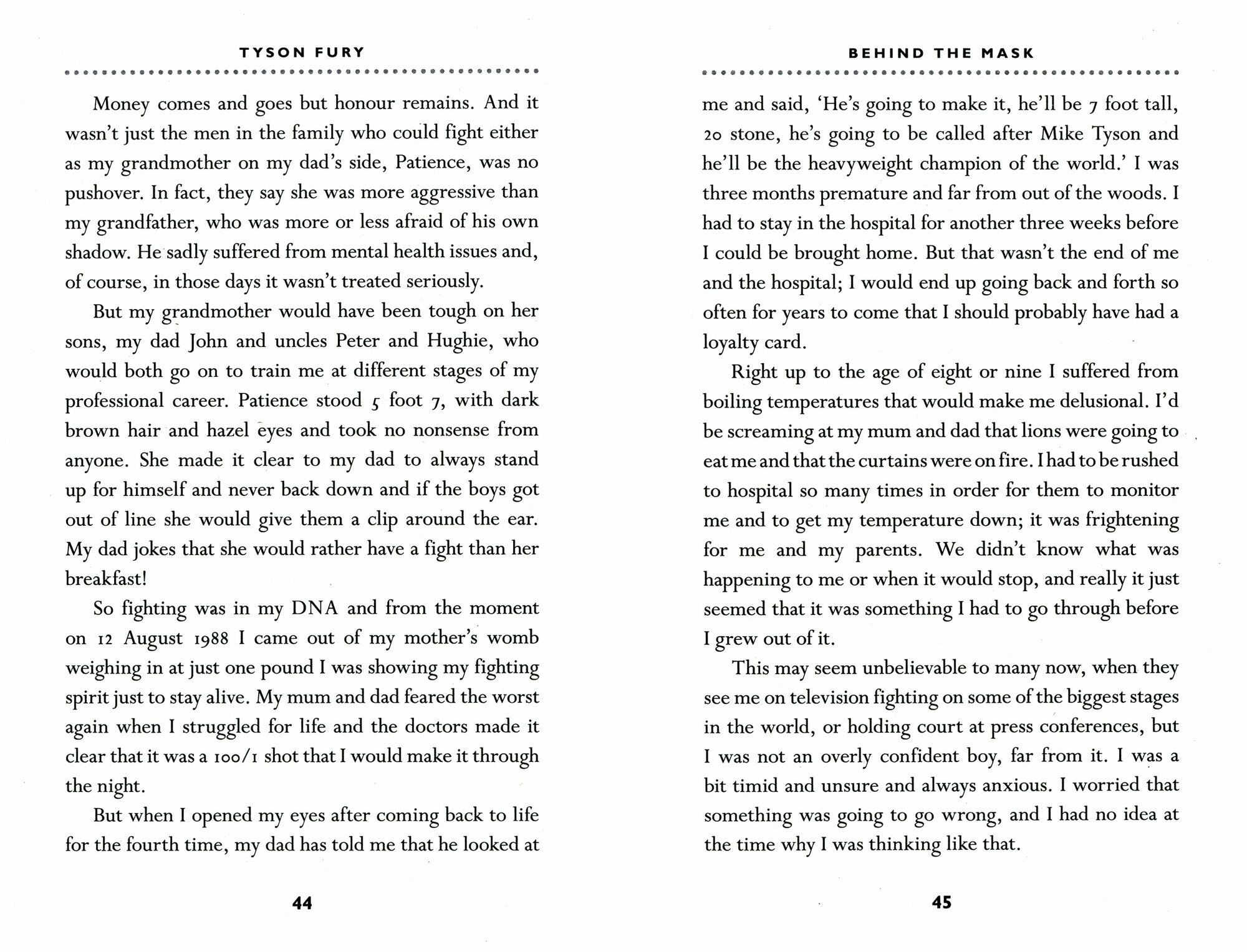 A Manchester lad from Irish Traveller stock, born three months premature and weighing just a pound at birth, Tyson (named after his father's boxing hero) grew up to become one of the most unlikely heavyweight champions in history. This 'dream come true' soon turned to nightmare, however, as alcohol and cocaine abuse took hold and Tyson was stripped of his titles. What followed was the darkest moment of his life - detailed in this book for the first time - in which he came within seconds of ending everything.
