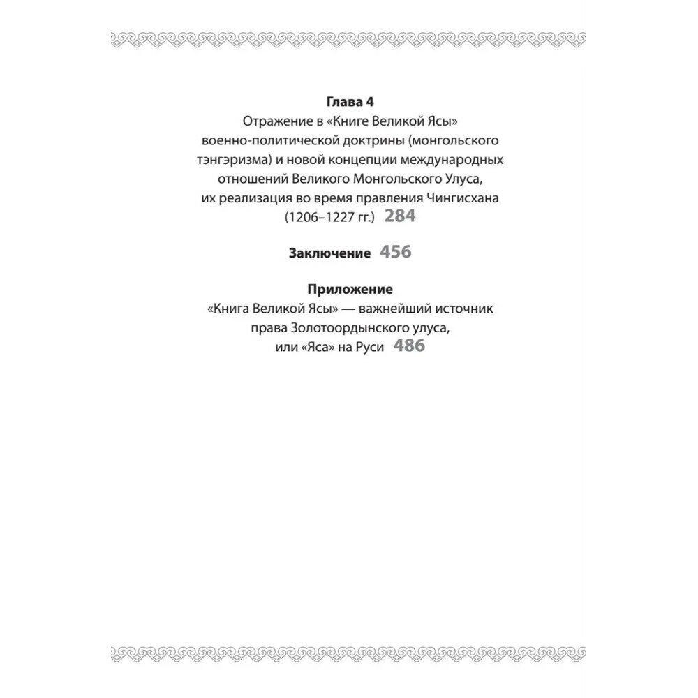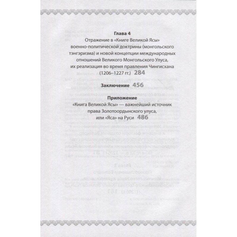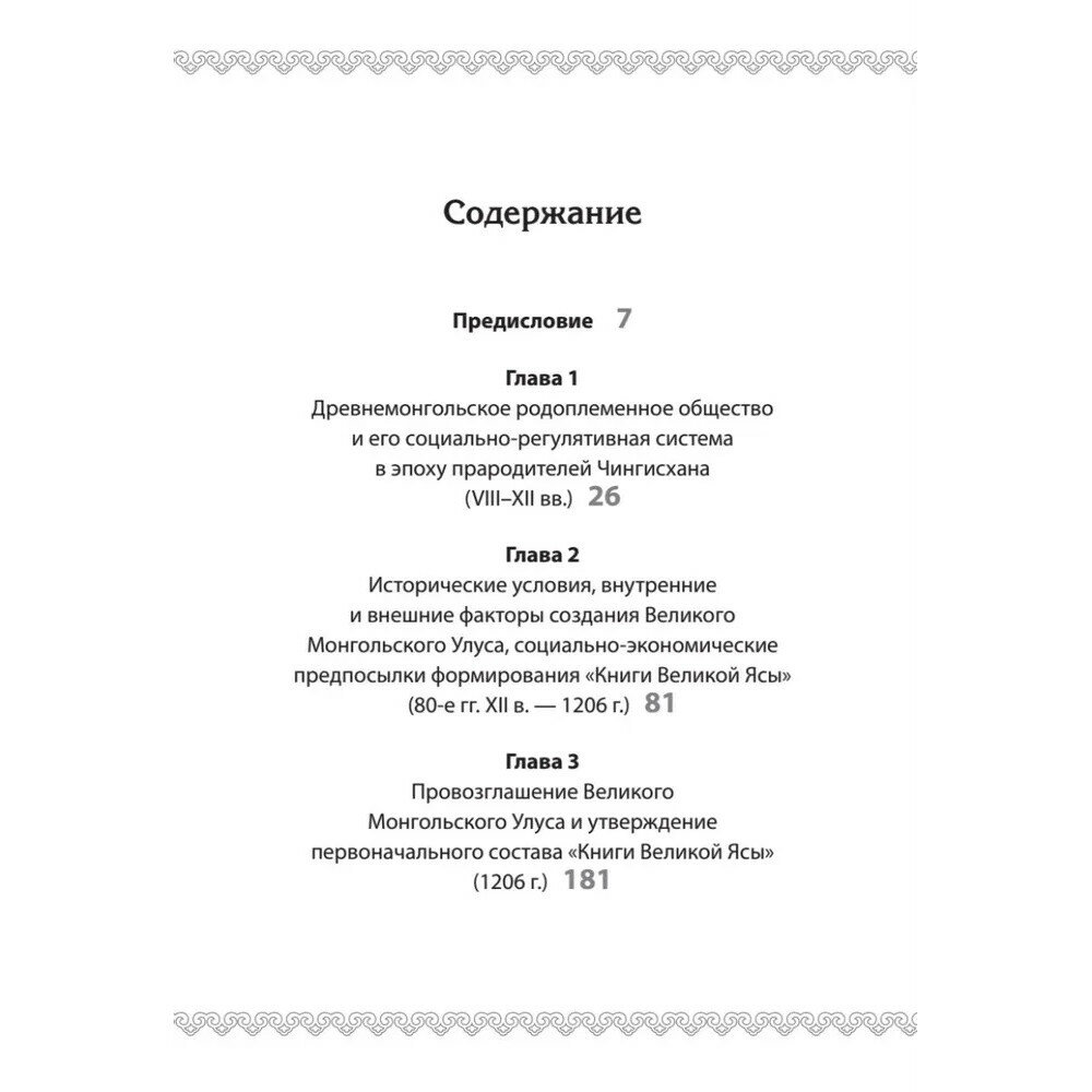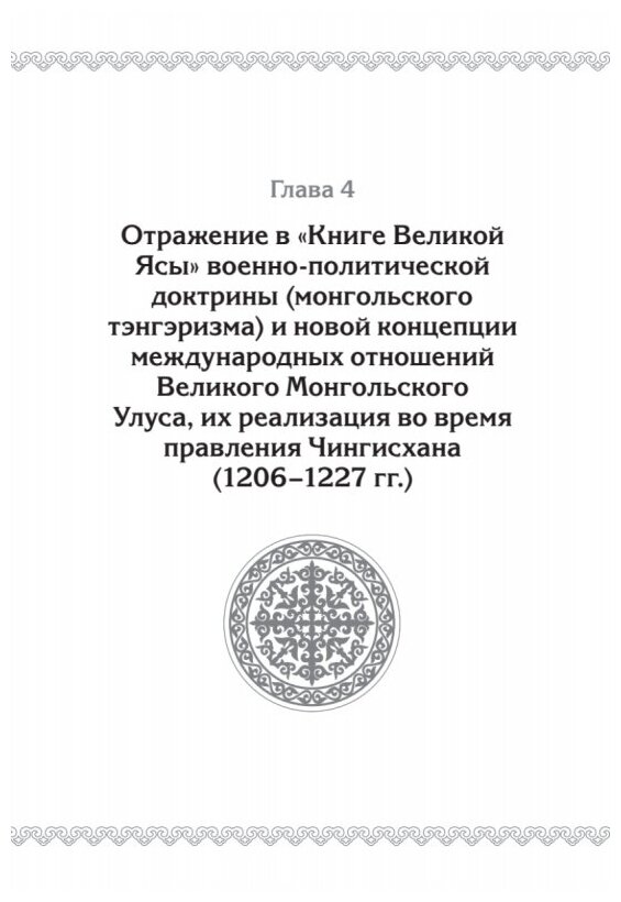 На фоне наиболее значимых исторических событий эпохи Чингисхана реконструированы все этапы процесса формирования и эволюции государственно-правовой системы Великого Монгольского Улуса, читателю представлены и прокомментированы практически все фрагменты "Книги Великой Ясы" Чингисхана, дошедшие до нас из глубины веков. Особое внимание было уделено нашедшим свое отражение в "Книге Великой Ясы" военно-политической доктрине (монгольскому тэнгэризму) и новой концепции международных отношений Великого Монгольского Улуса, и их реализации во время правления Чингисхана (1206-1227 гг.).